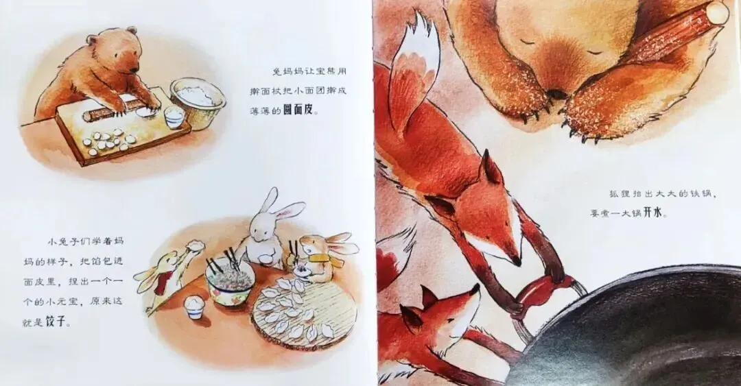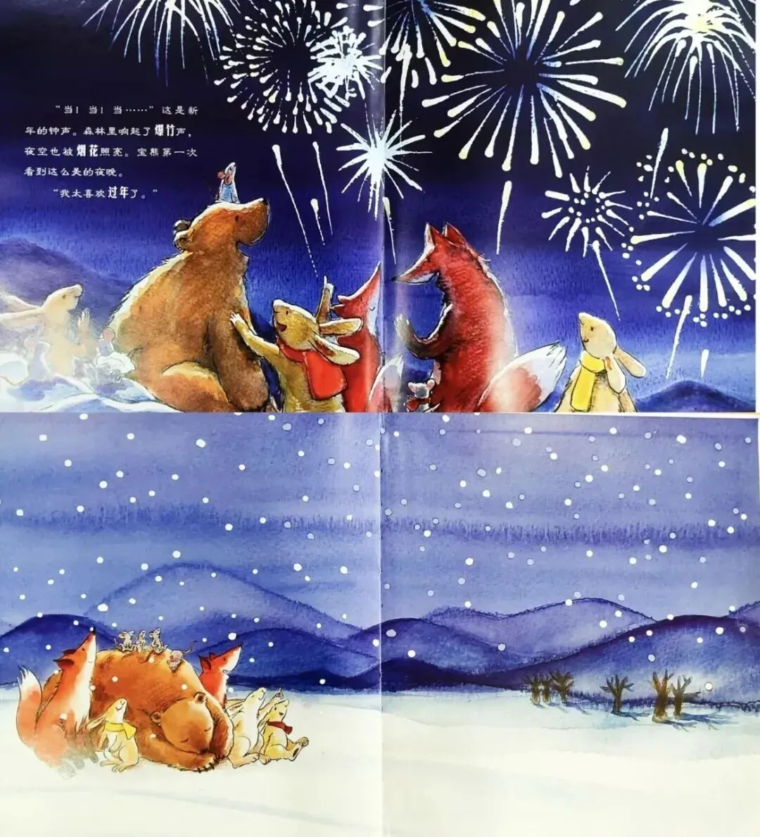 兔妈妈让宝熊用擀面杖把小面团擀成薄薄的圆面皮。小兔子们学着妈妈的样子,把馅包进面皮里,捏出一个一个的小元宝,原来 这就是饺子。狐狸拾出大大的锅,要煮一大锅开水。宝熊第一次和大家一起过年,第一次尝到了香喷喷的饺子。“当!当!当……”这是新年的钟声。森林里响起了爆竹声,夜空也被烟花照亮。宝熊第一次看到这么美的夜晚。