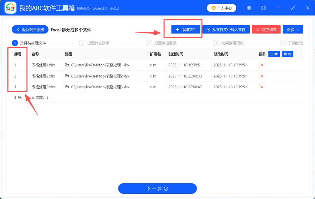 第二步:点击【添加文件】或一键拖拽上传,上传好需要拆分的Excel文件。
