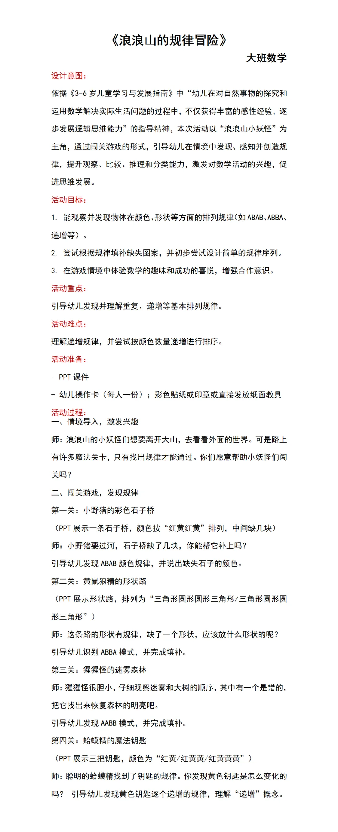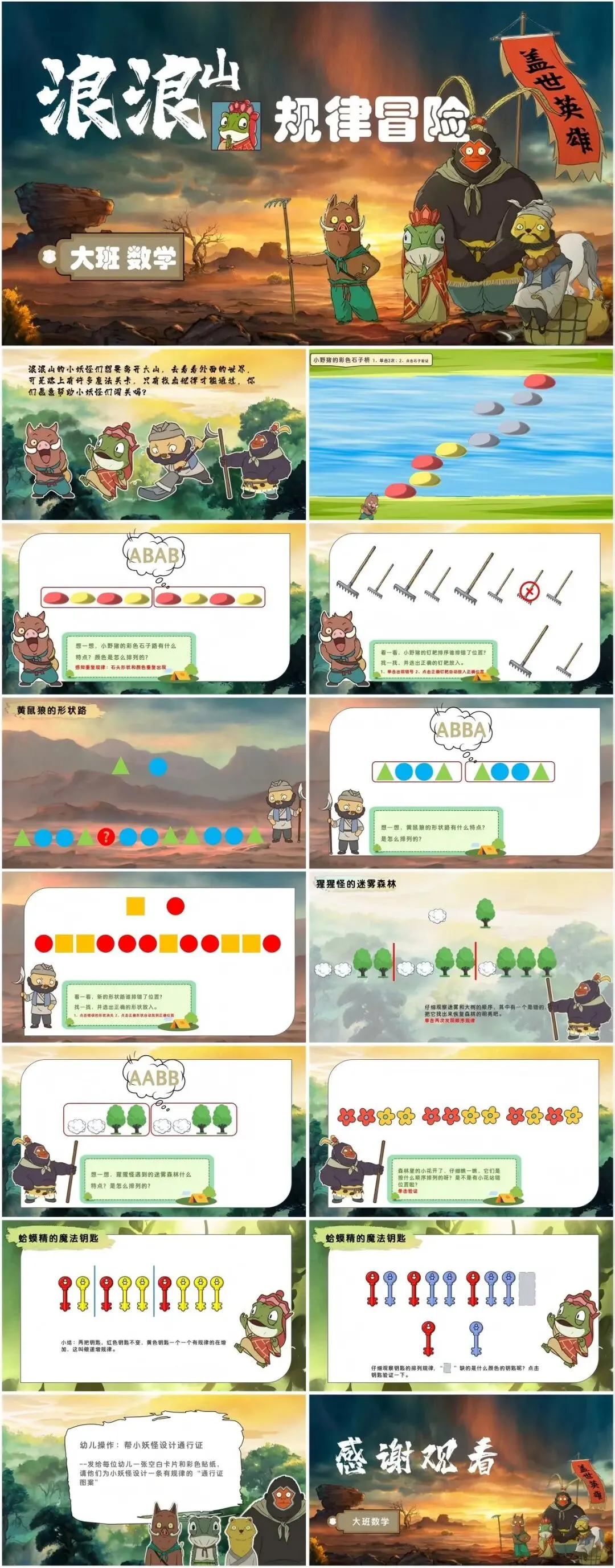 >大班数学领域<<浪浪山的规律冒险>>PPT课件+教案+说课稿+教具打印图