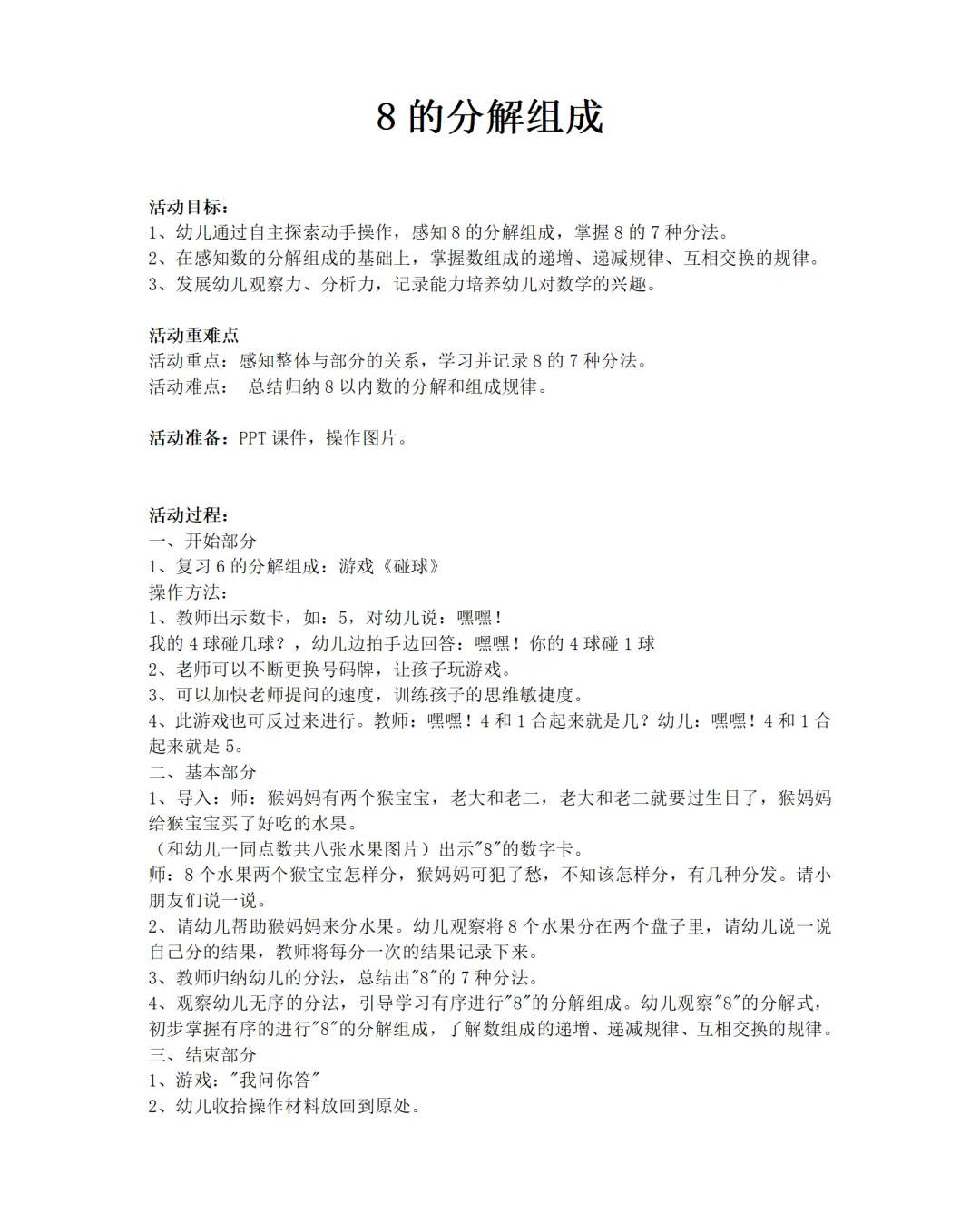 >大班数学领域<<8的分解与组成>>PPT课件+教案+操作图片