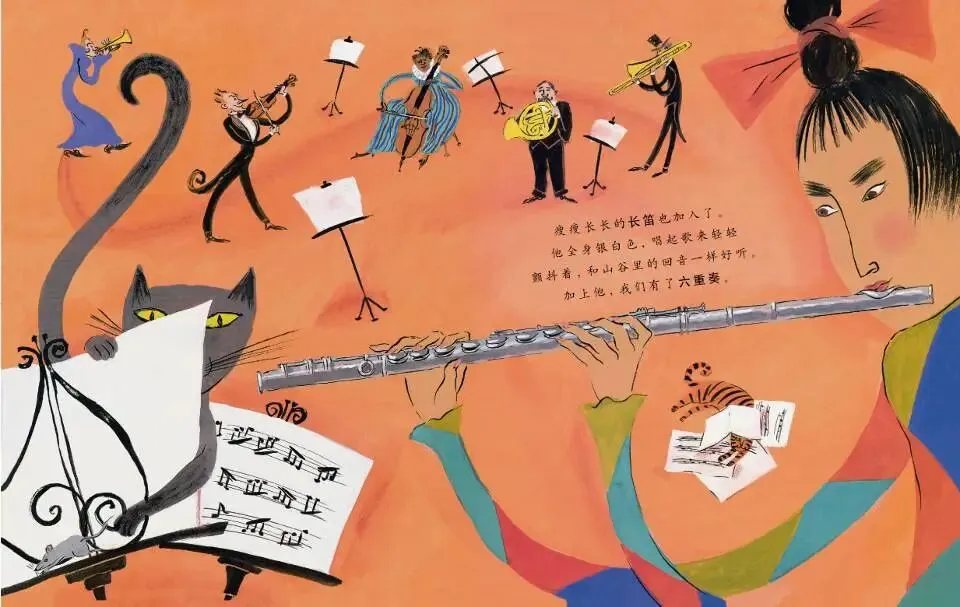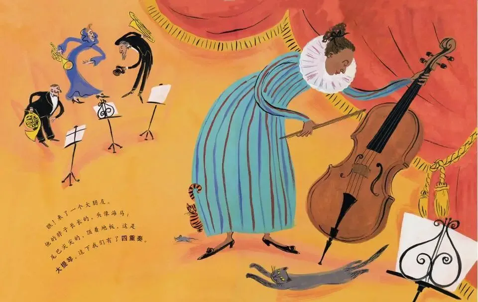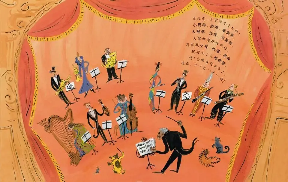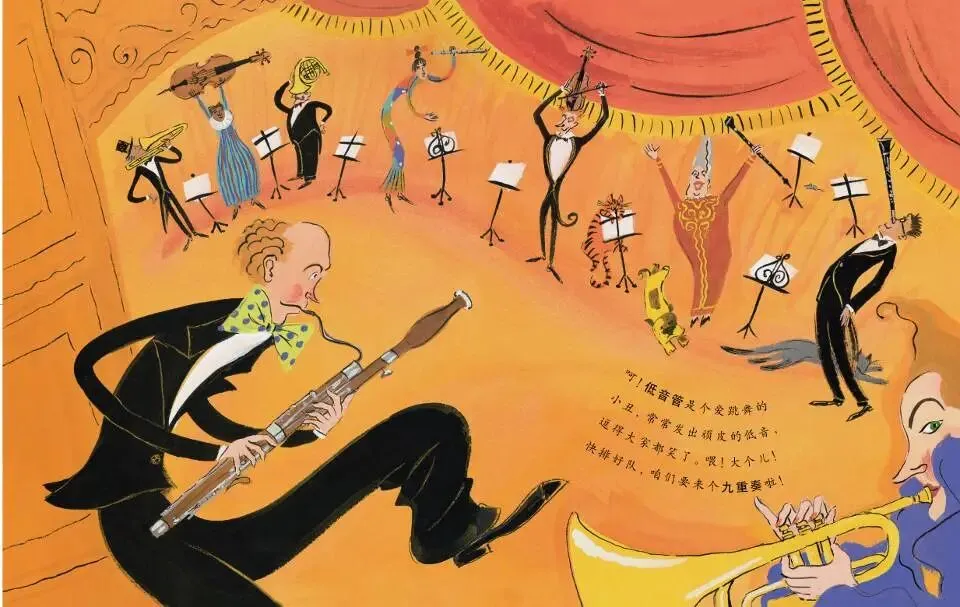 十人组室内乐团开始演出啦!十件造型各异的乐器,发出不同的美妙音色。每一位演奏者特别的造型、体态及服装,与其演奏的乐器在造型上相互配合呼应,轻松有趣。