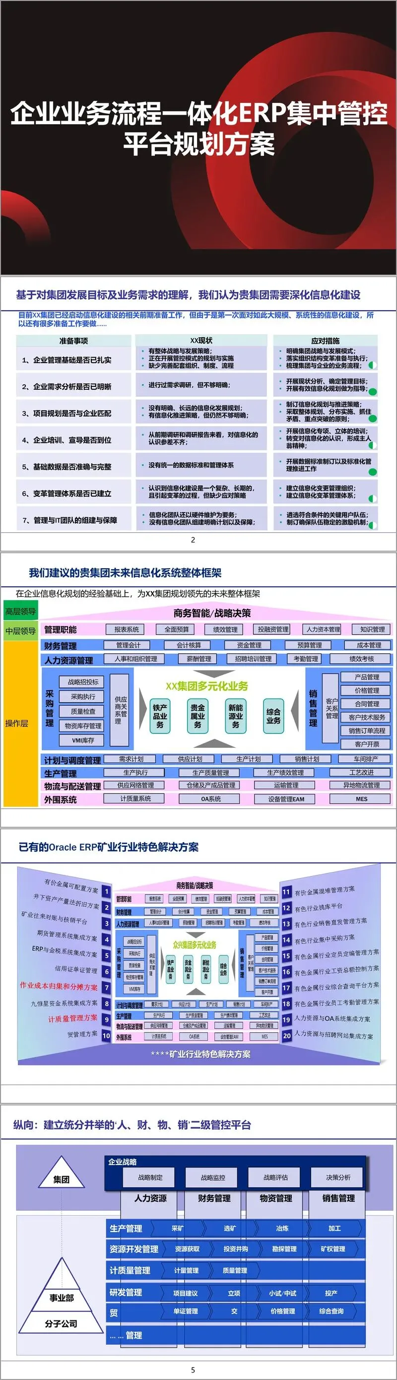 本方案围绕XX集团构建企业业务流程一体化管控平台的战略目标,系统提出了从现状分析、业务需求、系统架构、实施路径到运维保障的全面规划。方案基于对矿业行业特性的深刻理解,结合集团现有信息化基础,提出以ERP为核心,覆盖人力资源、财务、物资、销售等核心业务的集中管控平台,并分三阶段推进实施,旨在实现管理提升与数字化转型。