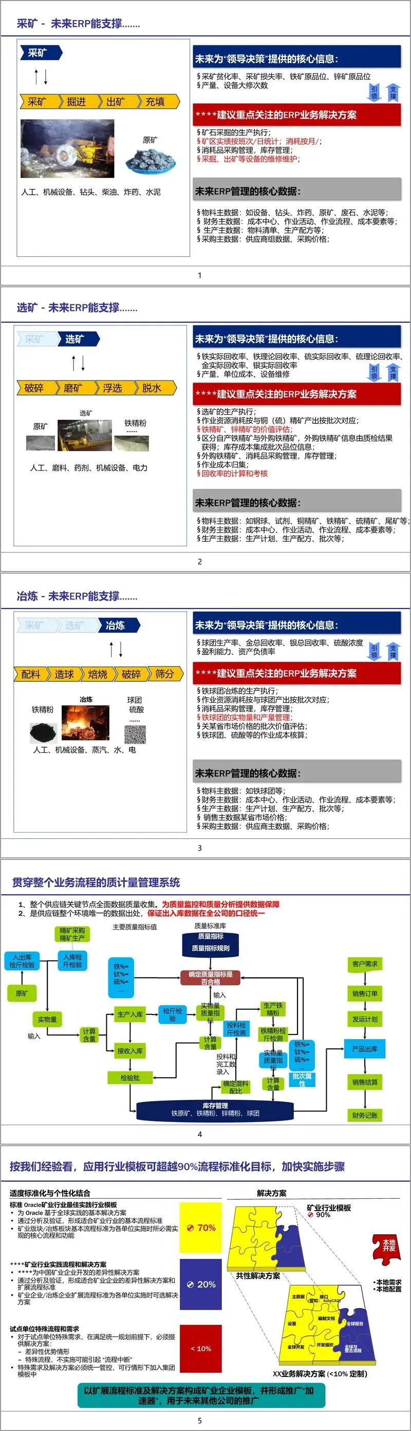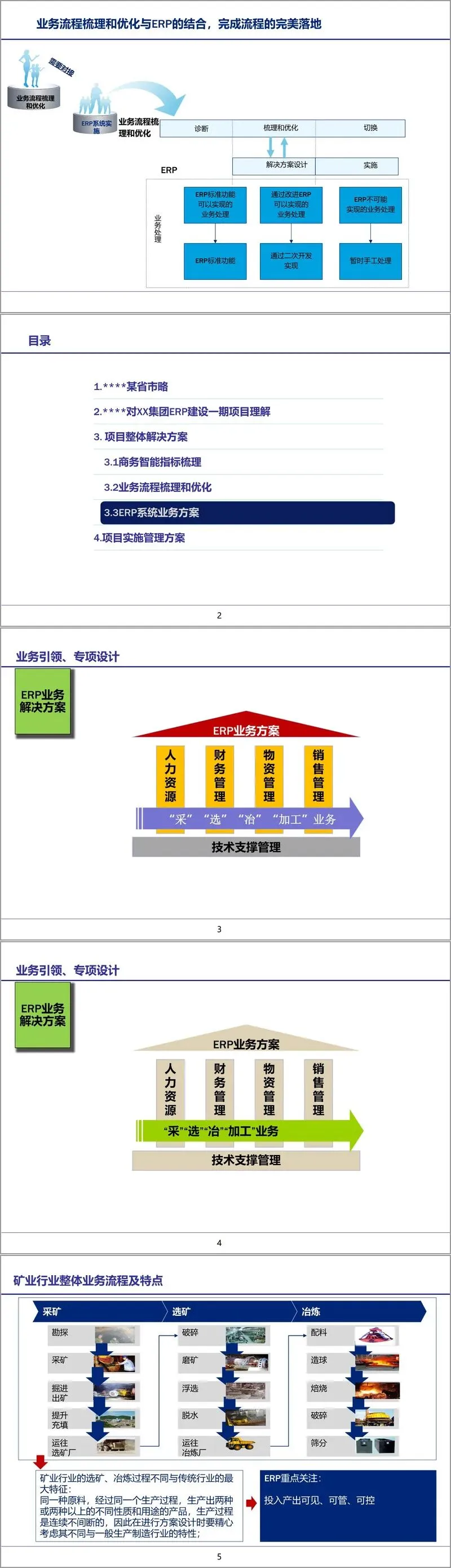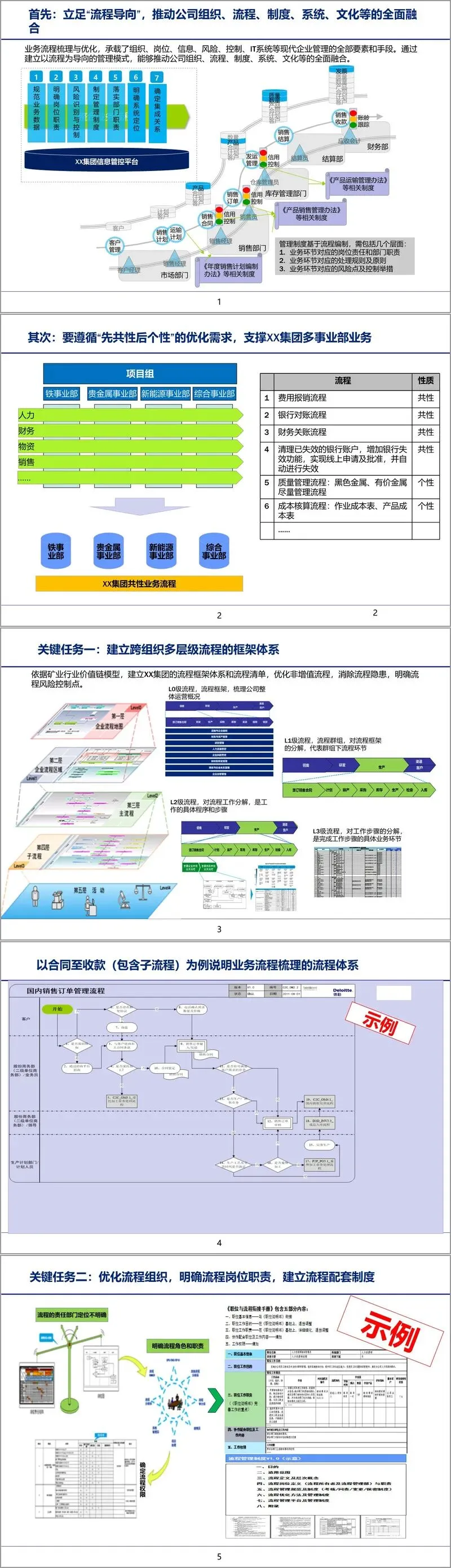 方案强调业务流程梳理是推动组织、制度、系统与文化融合的核心。通过建立跨组织多层级的流程框架体系(L0-L3级),明确流程责任与权限,配套制度与岗位职责,实现“规范数据、识别风险、落实职责、制定制度”七步闭环。尤其在矿业行业,针对“采、选、冶、加工”多产品共线生产的特点,设计了涵盖投入产出管控、成本归集、质量追溯的专项流程。