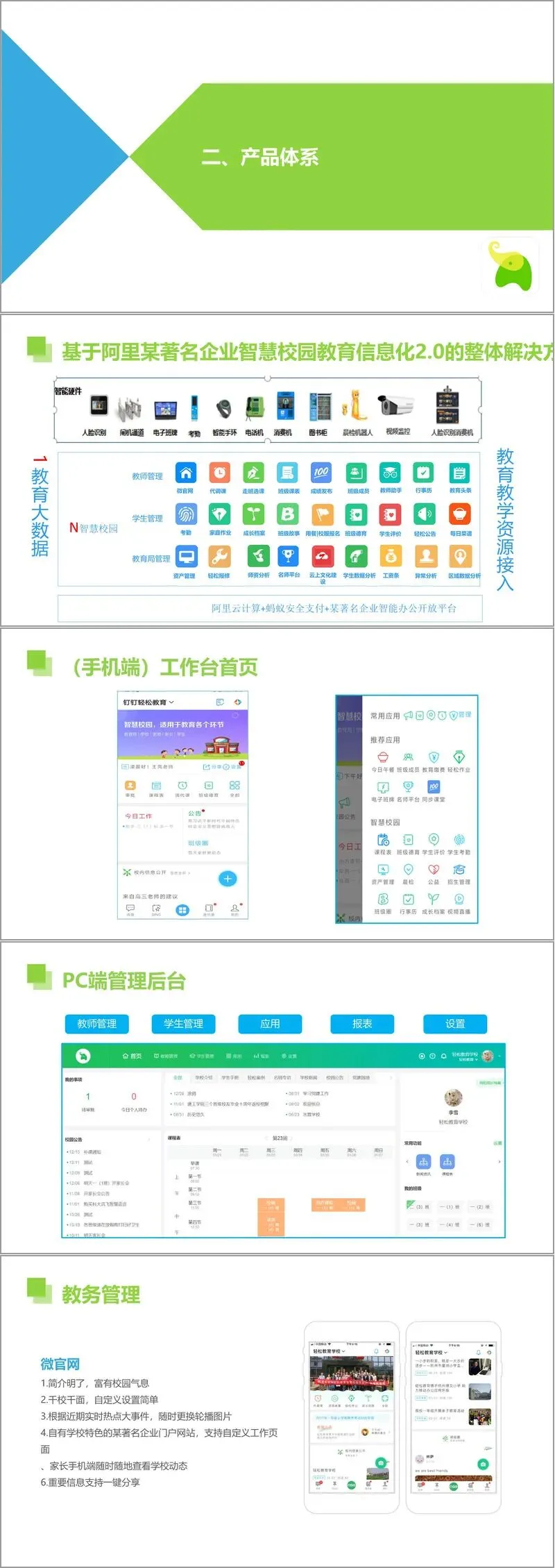 产品体系涵盖教师管理、学生管理、教育局管理、智能硬件与教育大数据五大板块。平台深度融合阿里云计算、蚂蚁安全支付与企业智能办公平台,构建从电子班牌、人脸识别支付、闸机通道,到智能手环、消费机等硬件生态,实现校园全场景数字化覆盖。