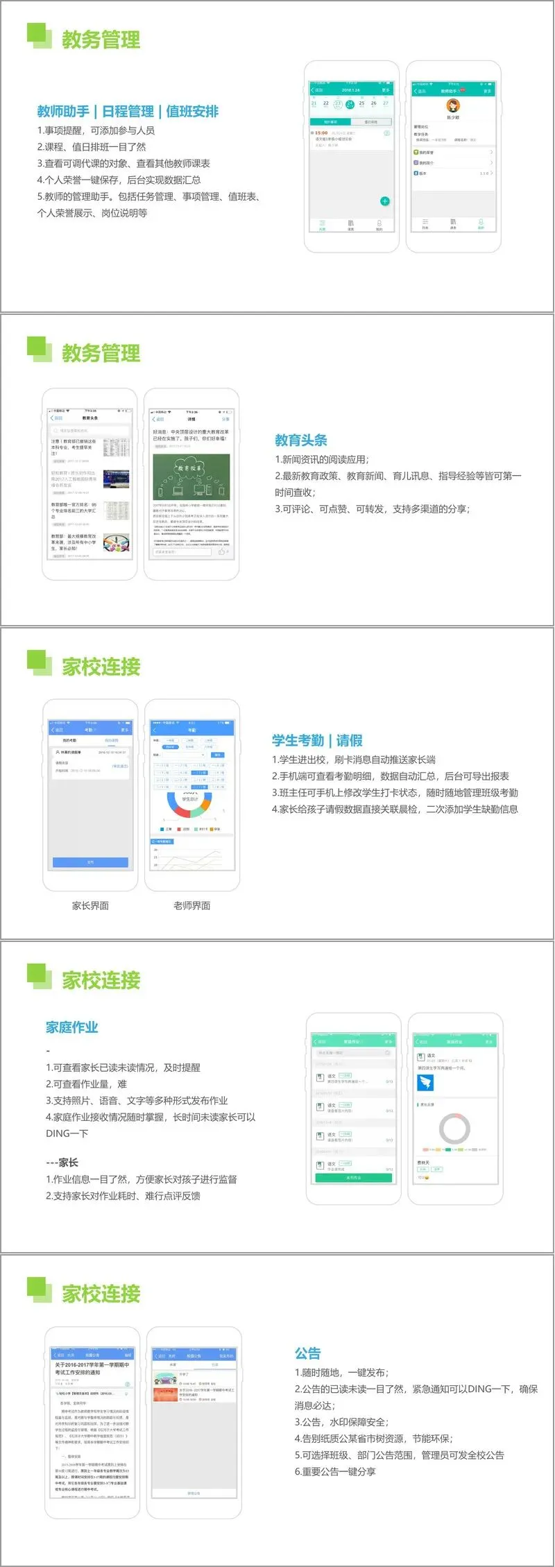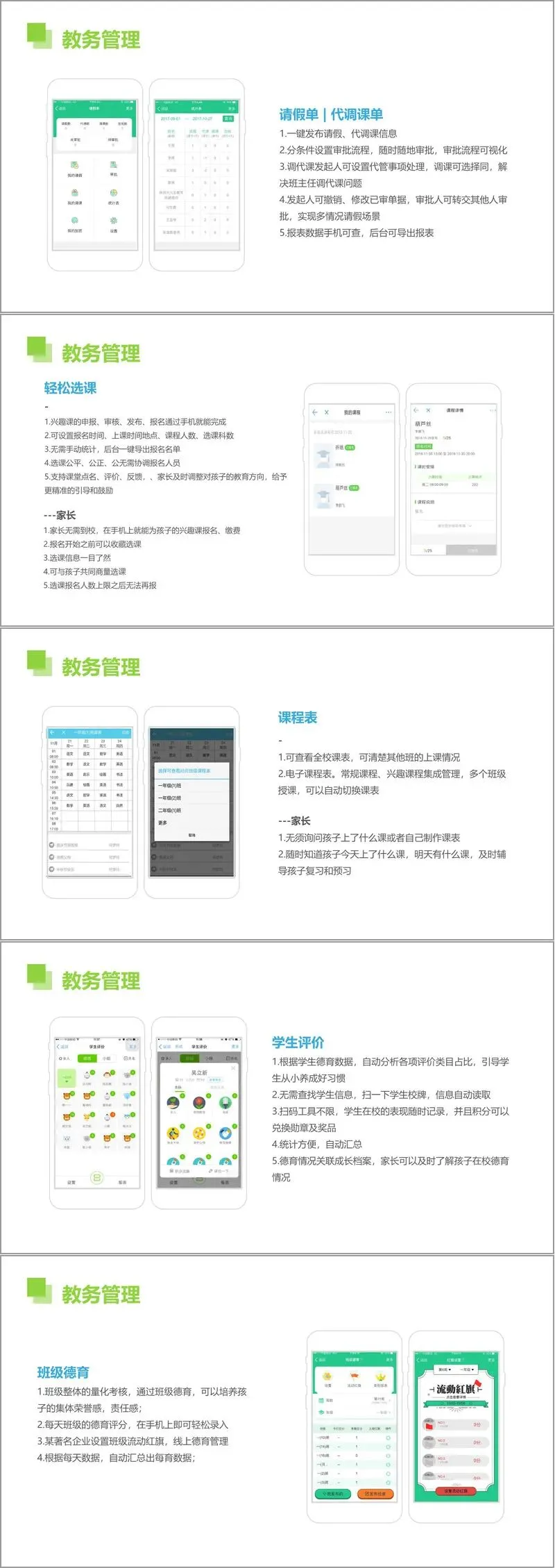 在教务管理方面,系统支持请假调课、兴趣课选报、课程表管理、学生德育评价、教师日程安排等功能。通过移动端与PC端协同,实现流程可视化、审批灵活化、数据可导出,极大提升管理效率。家校连接模块涵盖作业通知、校园公告、在线报名、成长档案、班级圈互动等功能,增强学校与家庭之间的实时沟通与信任。