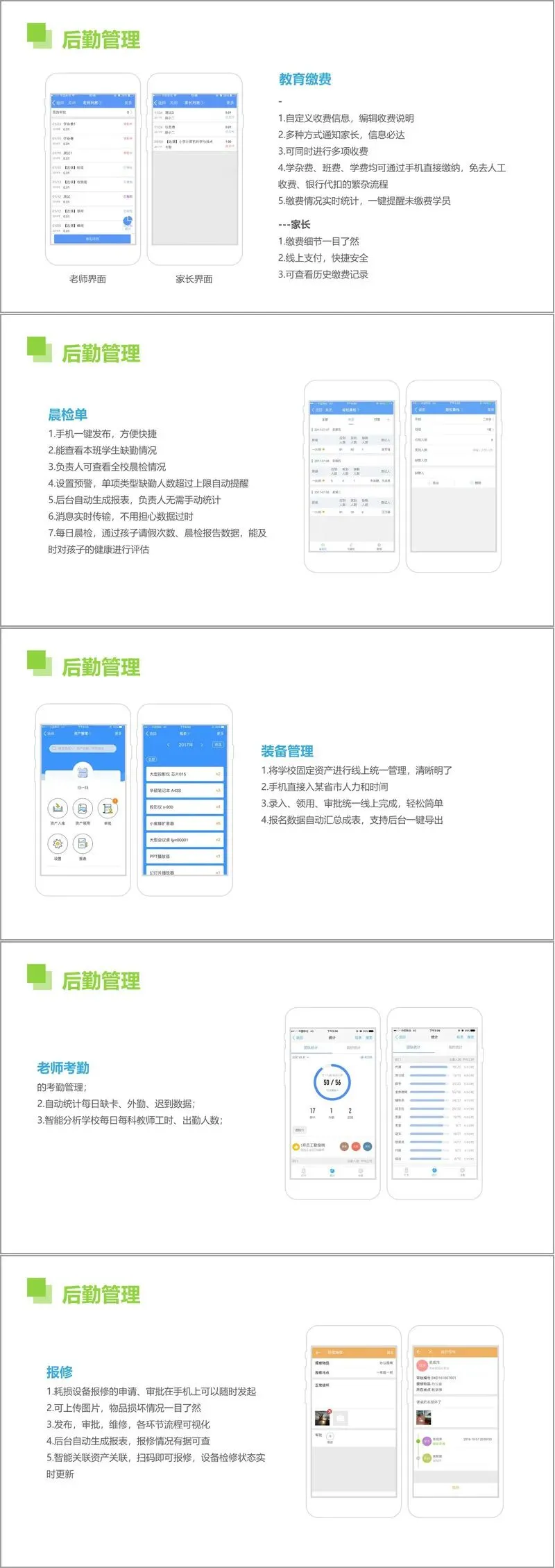 后勤管理模块包括晨检报告、资产装备、教师考勤、设备报修等,实现校园运营的线上化、智能化。例如,晨检数据可自动预警,资产扫码即可报修,各类报表自动生成,大幅减轻人工负担。