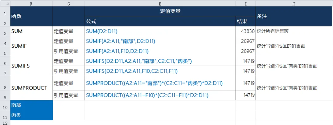 根据这类样板数据,我列了下通常可能需要求和的情况,以及每种求和的公式在这里,这样对比看一目了然就清楚怎么使用这些公式了。