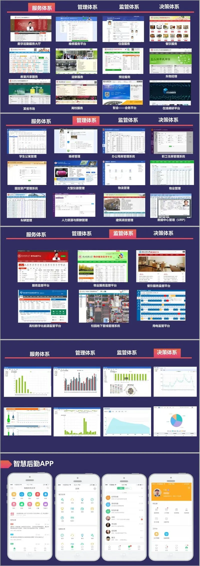 智慧后勤的建设范畴被清晰地划分为四大应用体系:服务体系、管理体系、监管体系和决策体系。