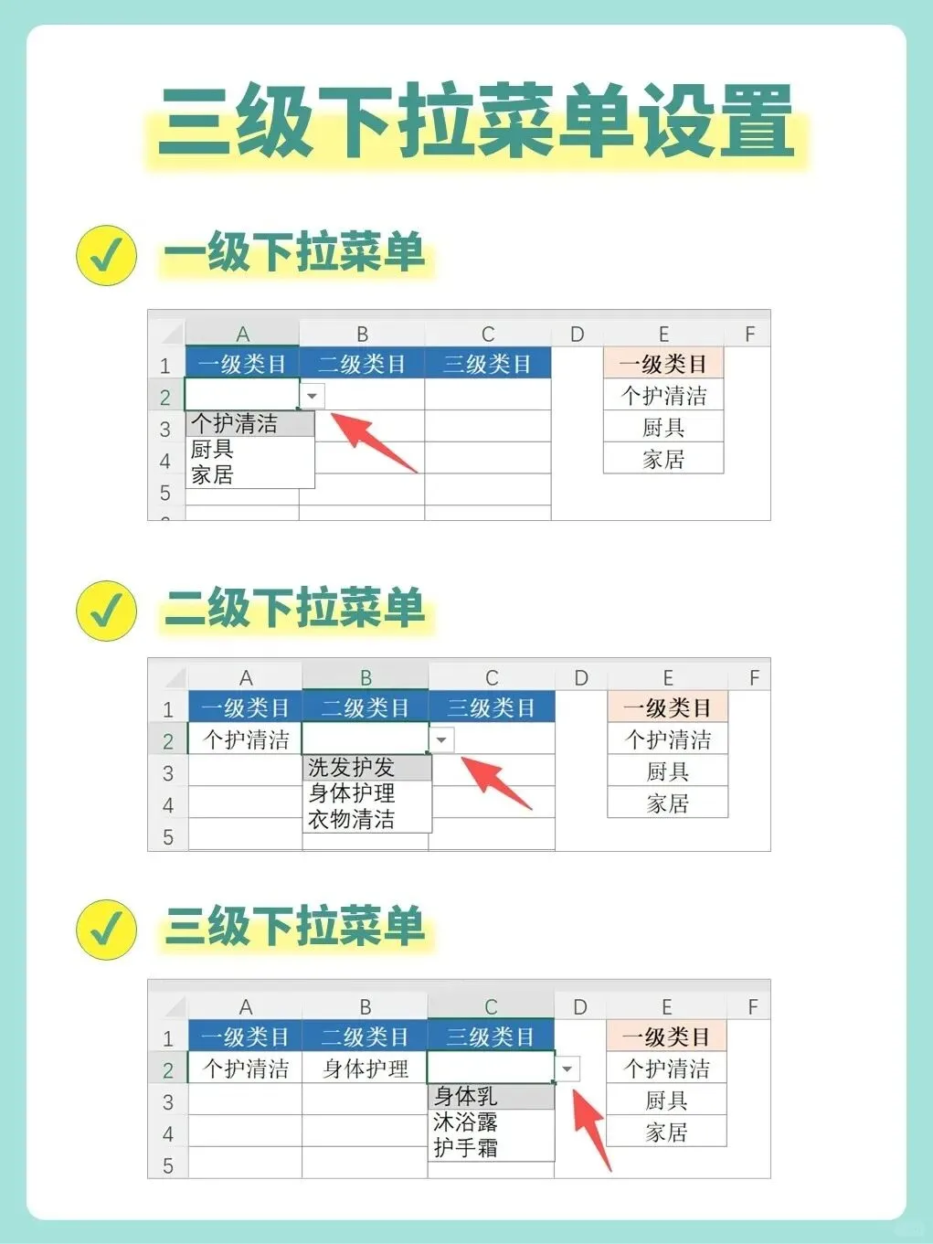 E列:存放所有“一级类目”,如“个护清洁”、“厨具”、“家居”。