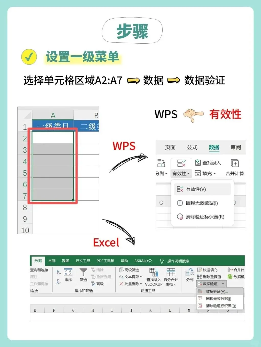 1.选中需要设置一级菜单的单元格区域(例如 A2:A7)。