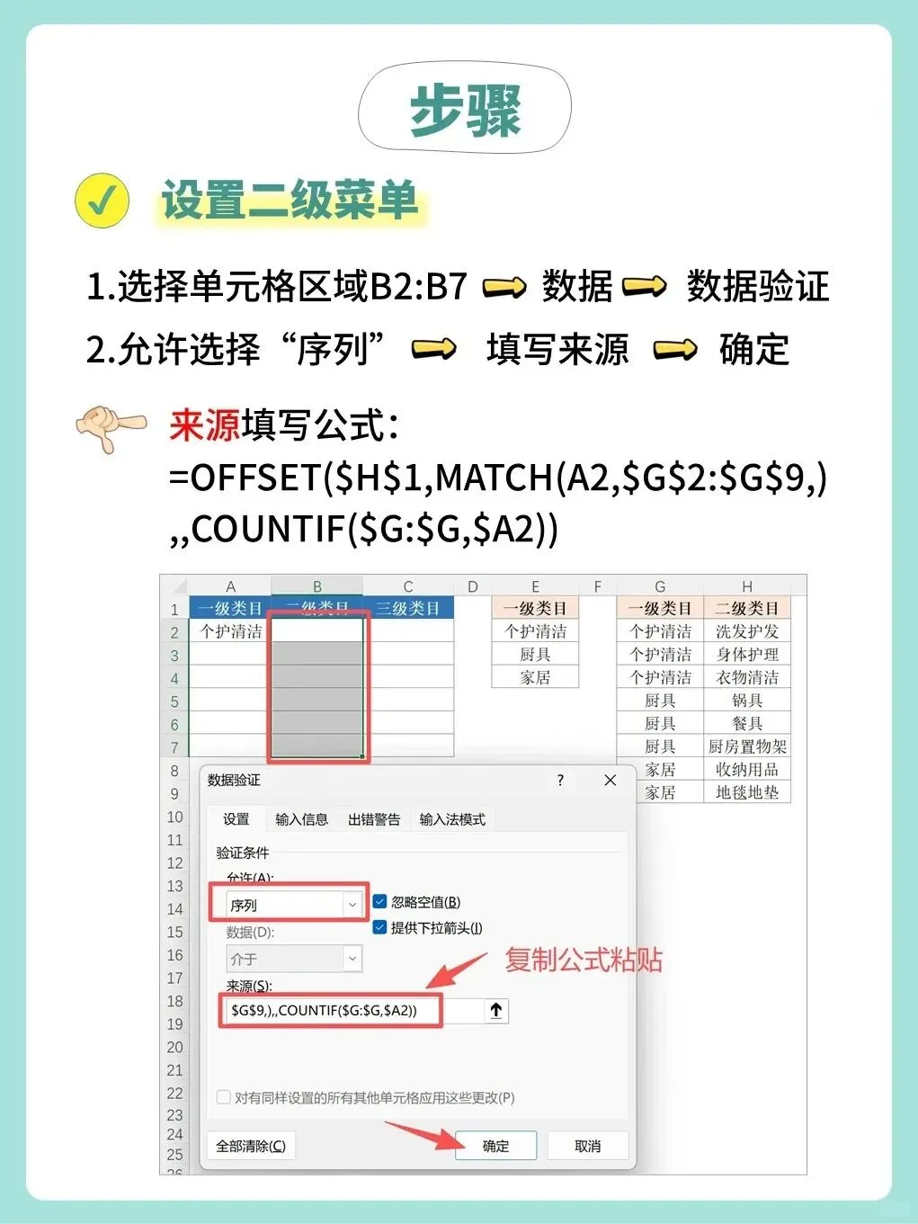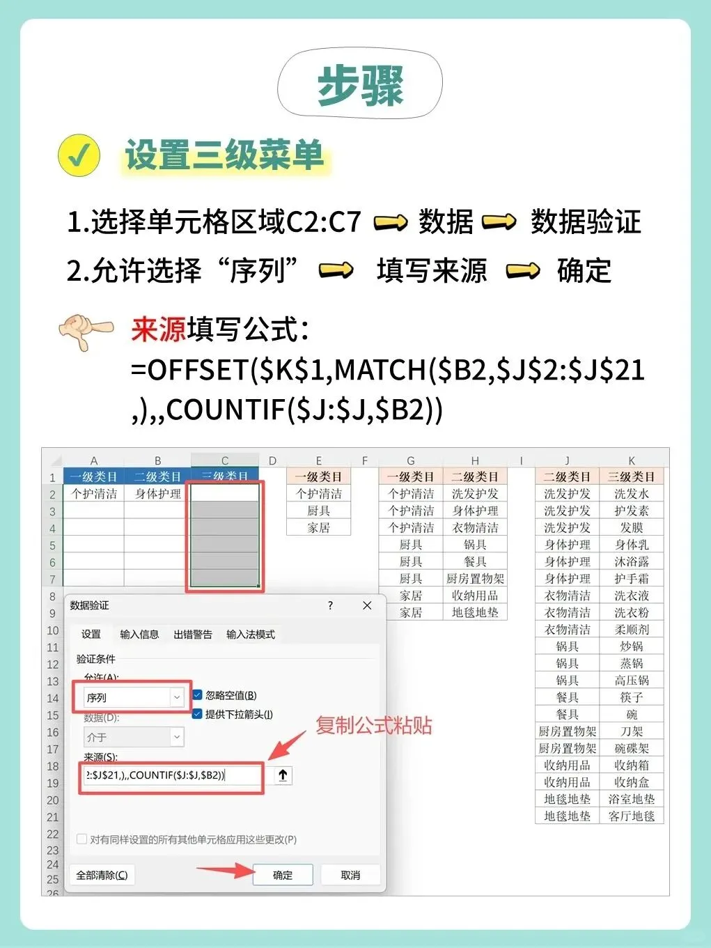 这个公式与第二步的公式结构一致,只是将查找值从A2(一级)换成了B2(二级),将查找区域和偏移起点相应调整到了三级类目数据源所在的J列和K列。
