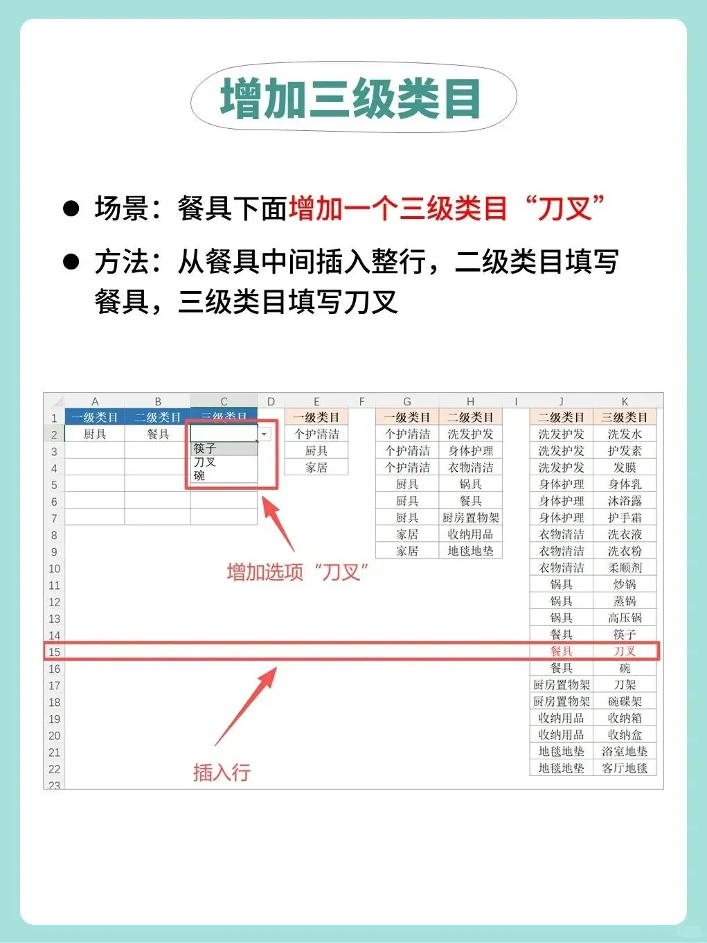 例如,想在“餐具”下增加“刀叉”,只需在数据源“餐具”区域中插入一行,在J列填“餐具”,K列填“刀叉”即可。
