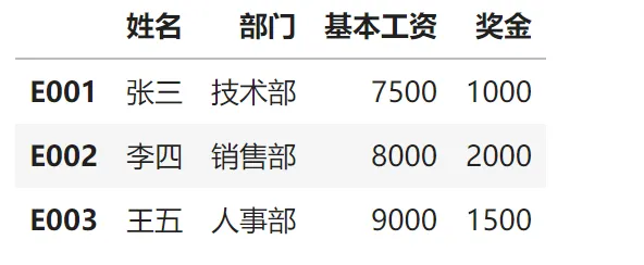 import pandas as pd# 员工基本信息表df1 = pd.DataFrame({'姓名': ['张三', '李四', '王五'],'部门': ['技术部', '销售部', '人事部']}, index=['E001', 'E002', 'E003']) # 索引:员工编号# 员工工资表df2 = pd.DataFrame({'基本工资': [8000, 9000, 7500],'奖金': [2000, 1500, 1000]}, index=['E002', 'E003', 'E001']) # 注意:顺序不同!# 神奇的事情发生了:自动按索引对齐!data = df1.join(df2)data输出结果