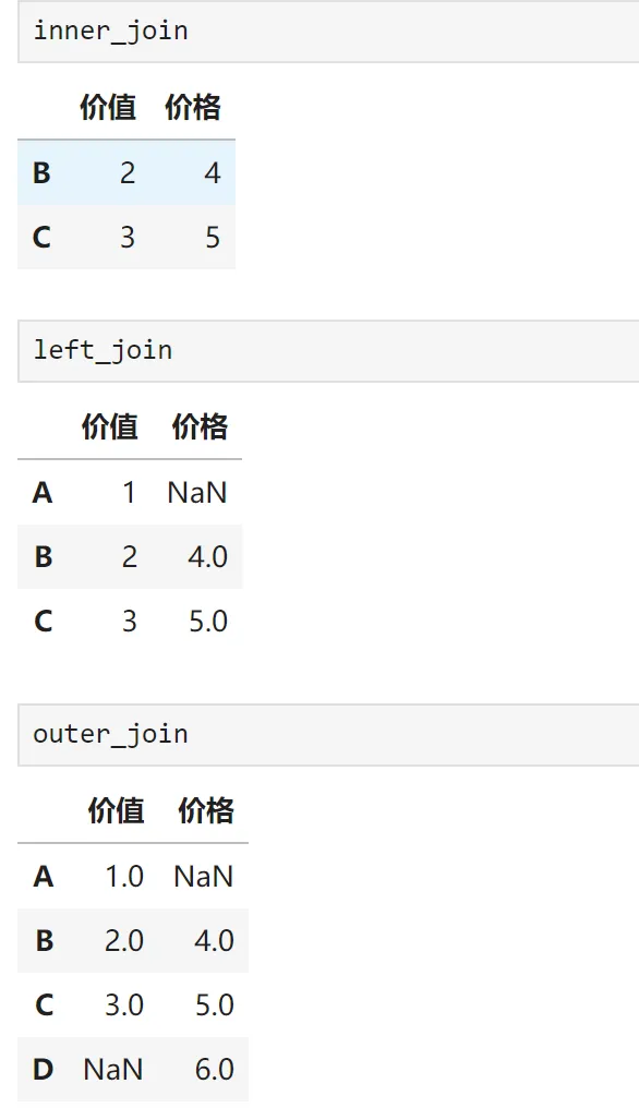 # 创建示例数据df1 = pd.DataFrame({'价值': [1, 2, 3]}, index=['A', 'B', 'C'])df2 = pd.DataFrame({'价格': [4, 5, 6]}, index=['B', 'C', 'D'])# 模式1:内连接(只保留两者都有的)inner_join = df1.join(df2, how='inner') # 只保留B、C# 模式2:左连接(以左边为主)left_join = df1.join(df2, how='left') # 保留A、B、C,D没有# 模式3:外连接(全部保留)outer_join = df1.join(df2, how='outer') # A、B、C、D都保留输出结果