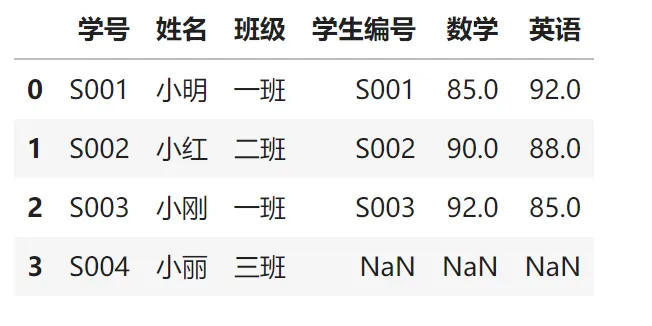 # 模拟Excel常见场景:学生成绩合并students_data = pd.DataFrame({'学号': ['S001', 'S002', 'S003', 'S004'],'姓名': ['小明', '小红', '小刚', '小丽'],'班级': ['一班', '二班', '一班', '三班']})score_data = pd.DataFrame({'学生编号': ['S002', 'S001', 'S003', 'S005'],'数学': [90, 85, 92, 88],'英语': [88, 92, 85, 90]})# Python版"VLOOKUP"result = pd.merge(students_data, score_data, left_on='学号', # 左表的匹配列 right_on='学生编号', # 右表的匹配列 how='left') # 左连接模式result合并结果