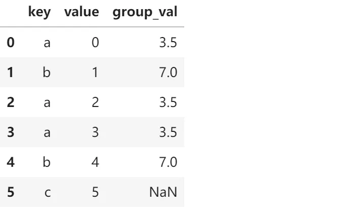 # 构建数据left1 = pd.DataFrame({'key':['a','b','a','a','b','c'],'value':pd.Series(range(6),dtype='Int64')})right1 = pd.DataFrame({'group_val':[3.5,7,9]}, index=['a','b','d'])# 合并表格,左表的key和右表的主键进行匹配merge_data = pd.merge(left1,right1,left_on='key',right_index=True,how='left')merge_data输出结果