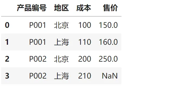 # 复杂场景:同一产品在不同地区的价格product_data = pd.DataFrame({'产品编号': ['P001', 'P001', 'P002', 'P002'],'地区': ['北京', '上海', '北京', '上海'],'成本': [100, 110, 200, 210]})price_data = pd.DataFrame({'产品ID': ['P001', 'P001', 'P002', 'P002'],'区域': ['北京', '上海', '北京', '广州'], # 注意:广州没有成本数据'售价': [150, 160, 250, 260]})# 双条件匹配:产品编号 + 地区result = pd.merge(product_data, price_data, left_on=['产品编号', '地区'], right_on=['产品ID', '区域'], how='left')result[['产品编号', '地区', '成本', '售价']]输出结果