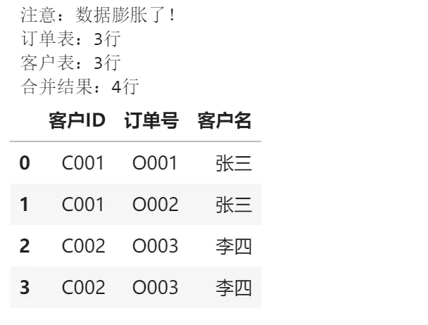 # 危险示例order_table = pd.DataFrame({'客户ID': ['C001', 'C001', 'C002'], # C001有两条记录!'订单号': ['O001', 'O002', 'O003']})customer_table = pd.DataFrame({'客户ID': ['C001', 'C002', 'C002'], # C002有两条记录!'客户名': ['张三', '李四', '李四']})result = pd.merge(order_table, customer_table, on='客户ID')print("注意:数据膨胀了!")print(f"订单表:{len(订单表)}行")print(f"客户表:{len(客户表)}行") print(f"合并结果:{len(result)}行")result输出结果