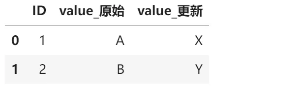 # 列名冲突示例df1 = pd.DataFrame({'ID': [1, 2], 'value': ['A', 'B']})df2 = pd.DataFrame({'ID': [1, 2], 'value': ['X', 'Y']}) # 相同列名!# 使用suffixes参数区分result = pd.merge(df1, df2, on='ID', suffixes=('_原始', '_更新')) # 自动添加后缀区分result输出结果
