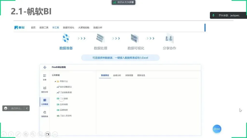 操作特点:与Power BI类似的数据处理流程(准备→处理→可视化→分享),但预置更多符合国内业务场景的分析模型