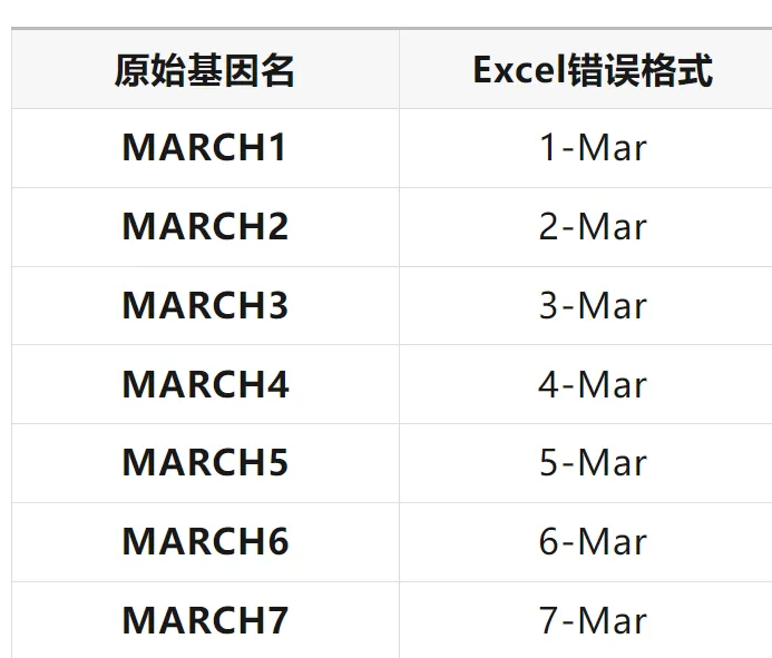 但最常见的,是**"MARCH1"、"SEPT2"、"SEPT6"** 这类以Mar、Sep开头的官方基因名。Excel会把**"MARCH1"自动转为"1-Mar","SEPT2"转为"2-Sep","DEC1"转为"1-Dec"**!
