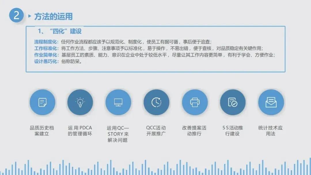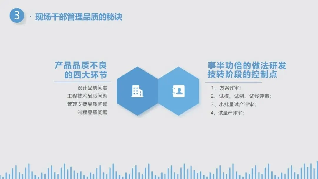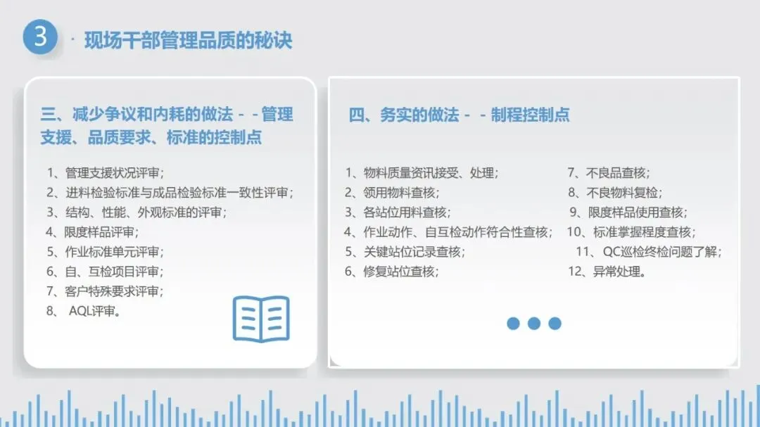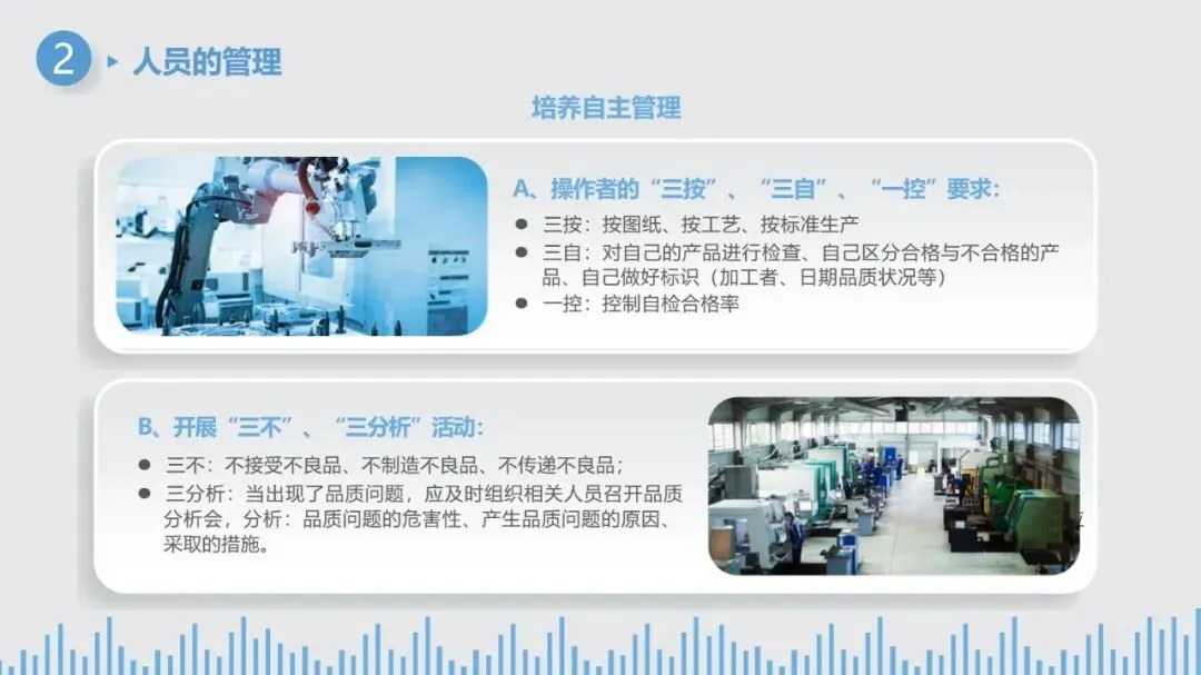 现场质量管理不是一个人的事情,必须将质量意识贯彻到生产的各个环节,以规范的程序和有效的工具进行持续改进,这样才能确保质量,提高生产效率,达到双赢的效果。