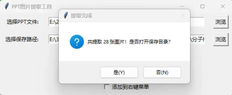 操作流程简单到不用学:第一步选择需要提取资源的 PPT 文件,第二步设置好提取后文件的保存路径,最后点击【提取图片】按钮,就能启动提取流程。
