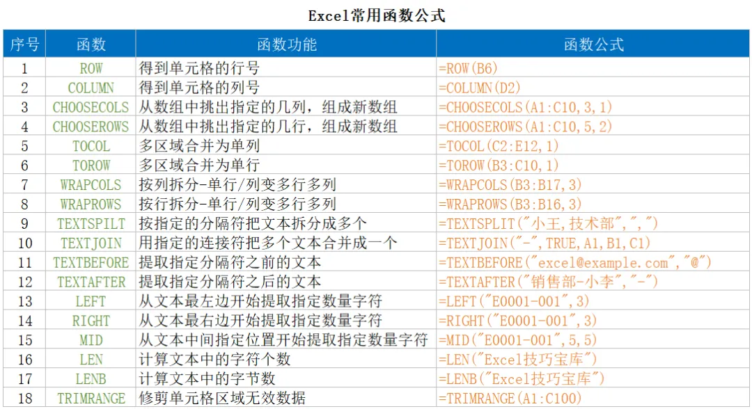 大家好,今天我精心整理了另外18个电子表格常用的函数,这些函数都能够让你的表格处理工作变得更加高效。现在我们一起来看看都有哪些函数吧!函数功能:返回单元格的行号函数语法:=ROW([要获取行号的单元格引用])应用公式:=ROW(B6)该函数的含义是:返回单元格B6所在的行号,结果是6。函数功能:返回单元格的列号函数语法:=COLUMN([要获取列号的单元格引用])应用公式:=COLUMN(D2)该函数的含义是:返回单元格D2所在的列号(D是第4列),结果是4。函数功能:从数组中挑出指定的几列,组成新数组。函数语法:=CHOOSECOLS(要提取的数组, 要返回的第1列, [要返回的第2列]...)应用公式:=CHOOSECOLS(A1:C10,3,1)该函数的含义是:从区域A1:C10中,先提取第3列(C列),再提取第1列(A列),组成一个新数组。函数功能:从数组中挑出指定的几行,组成新数组。函数语法:=CHOOSEROWS(要提取的数组, 要返回的第1行, [要返回的第2行]...)应用公式:=CHOOSEROWS(A1:C10,5,2)该函数的含义是:从区域A1:C10中,先提取第5行,再提取第2行,组成一个新的两行数组。函数功能:多区域合并为单列函数语法:=TOCOL(数组或区域, [忽略何种值], [按行扫描])应用公式:=TOCOL(C2:E12,1)如果有空单元格的,可增加参数1(忽略空单元格)该函数的含义是:将数据区域C2:E12转换为单列,参数1(忽略空单元格)。函数功能:多区域合并为单行函数语法:=TOROW(数组或区域, [忽略何种值], [按行扫描])应用公式:=TOROW(B3:C10,1)该函数的含义是:将数据区域B3:C10合并为一行,参数1(忽略空单元格)。函数功能:按列拆分-单行/列变多行多列函数语法:=WRAPCOLS(一维数组, 行数, [填充不足的值])应用公式:=WRAPCOLS(B3:B17,3)该函数的含义是:将区域B3:B17,转为5列3行的二维矩阵。函数功能:按行拆分-单行/列变多行多列函数语法:=WRAPROWS(一维数组, 列数, [填充不足的值])应用公式:=WRAPROWS(B3:B16,3)该函数的含义是:将区域B3:B16,转为3列5行的二维矩阵。函数功能:按指定的分隔符,把文本拆分成多列或多行。函数语法:=TEXTSPLIT(要拆分的文本, 列分隔符, [行分隔符])应用公式:=TEXTSPLIT("小王,技术部",",")该函数的含义是:用逗号","作为分隔符,将文本"小王,技术部"拆分成两列,结果分别是"小王"和"技术部"。函数功能:用指定的连接符,把多个文本合并成一个。函数语法:=TEXTJOIN(分隔符, 是否忽略空单元格, 文本1, [文本2]...)应用公式:=TEXTJOIN("-",TRUE,A1,B1,C1)该函数的含义是:用短横线"-"将A1、B1、C1三个单元格的内容连接起来,并忽略其中的空单元格。函数功能:提取指定分隔符之前的文本。函数语法:=TEXTBEFORE(原文本, 分隔符)应用公式:=TEXTBEFORE("excel@example.com","@")该函数的含义是:在文本"excel@example.com"中,提取"@"符号之前的部分,结果是excel。函数功能:提取指定分隔符之后的文本。函数语法:=TEXTAFTER(原文本, 分隔符)应用公式:=TEXTAFTER("销售部-小李","-")该函数的含义是:在文本"销售部-小李"中,提取短横线"-"之后的部分,结果是“小李”。函数功能:从文本最左边开始,提取指定数量的字符。函数语法:=LEFT(文本, [要提取的字符数])应用公式:=LEFT("E0001-001",3)该函数的含义是:从"E0001-001"的左边开始,提取前3个字符,结果是"E00"。函数功能:从文本最右边开始,提取指定数量的字符。函数语法:=RIGHT(文本, [要提取的字符数])应用公式:=RIGHT("E0001-001",3)该函数的含义是:从"E0001-001"的右边开始,提取最后3个字符,结果是"001"。函数功能:从文本中间指定的位置开始,提取指定数量的字符。函数语法:=MID(文本, 开始位置, 要提取的字符数)应用公式:=MID("E000-001",5,5)该函数的含义是:从"E0001-001"的第5个字符开始,提取5个字符,结果是"1-001"。函数功能:计算文本中的字符个数(汉字、字母、数字都算1)。函数语法:=LEN(文本)应用公式:=LEN("Excel技巧宝库")该函数的含义是:计算文本"Excel技巧宝库"包含多少个字符,结果是9。函数功能:计算文本中的字节数(汉字等双字节字符算2,英文数字算1)。函数语法:=LENB(文本)应用公式:=LENB("Excel技巧宝库")该函数的含义是:按字节计算文本"Excel技巧宝库"的长度,结果是13Excel=5, 技巧宝库=4*2=8,5+8=13函数功能:去除数组或区域中的无效数据函数语法:=TRIMRANGE(源数组, [处理方式], [删除什么])应用公式:=TRIMRANGE(A1:C100)该函数的含义是:处理A1:C100这个区域,自动修剪单元格区域无效数据(包括空值和包含空格的单元格)小结:常用的18个函数给大家总结成了以下图,大家可收藏用时查阅。以上就是今天的全部分享啦,希望这些Excel技巧能帮到有需要的你~如果大家在实际操作中遇到疑问,比如函数、快捷键、或是有其他Excel操作难题,都欢迎在评论区留言告诉我哦~后续也会根据大家高频提问的问题,整理更多实用技巧分享给大家!
