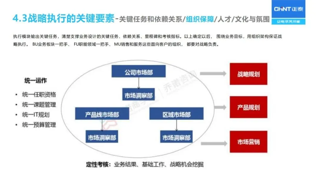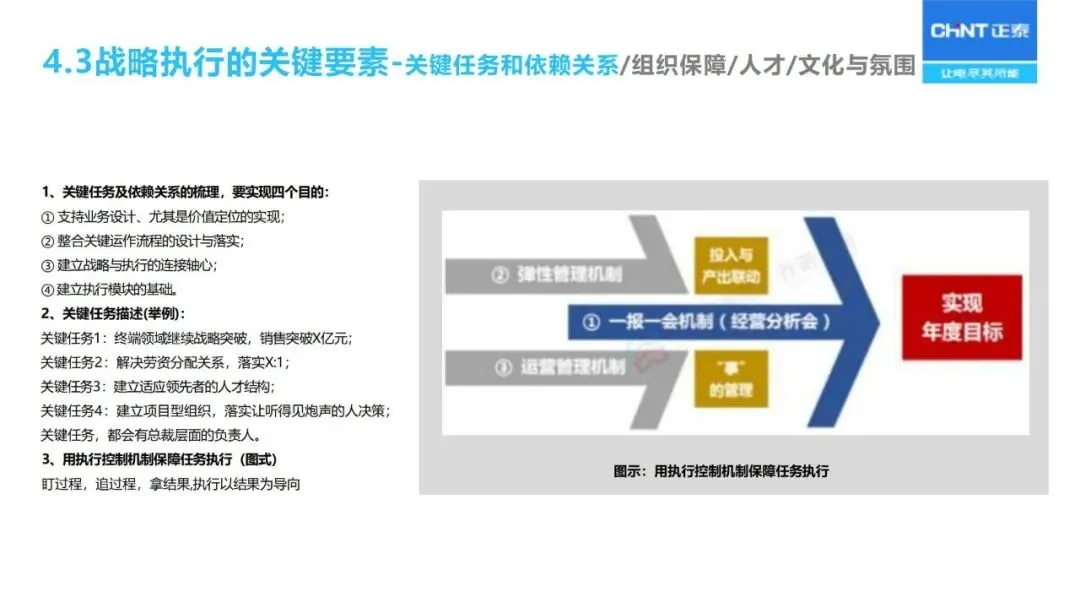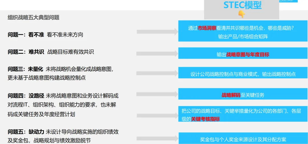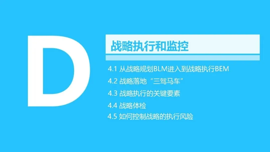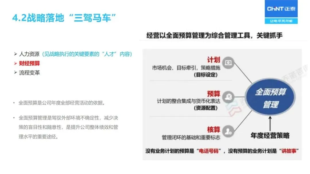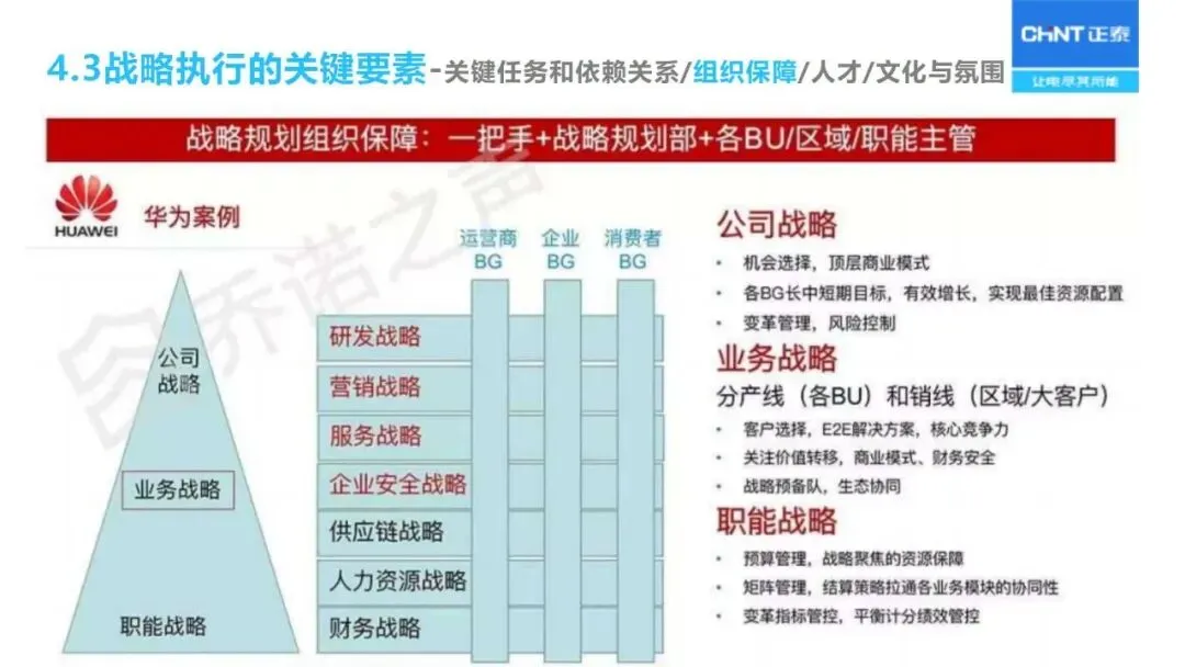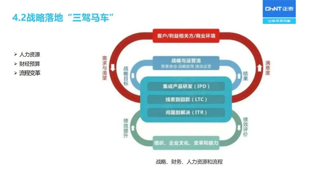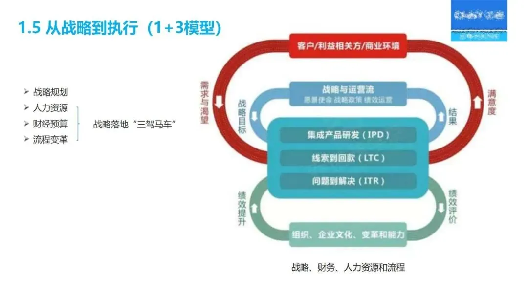 “三驾马车”为战略实施和监督保驾护航:人力资源重点关注核心人才的储备与能力建设;财务预算优化资源配置;流程改革优化从产品开发、销售线索到销售回款的整个过程;对关键任务的推进、组织的适宜性、人员的能力等进行定期的“战略体检”,对实施战略进行动态的调整。