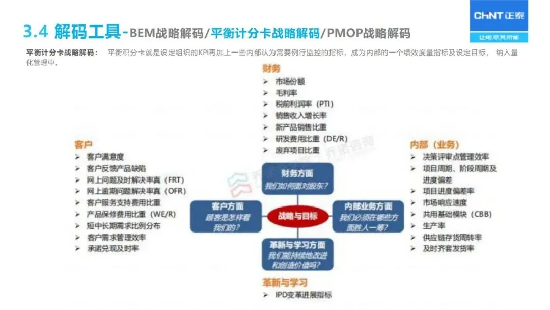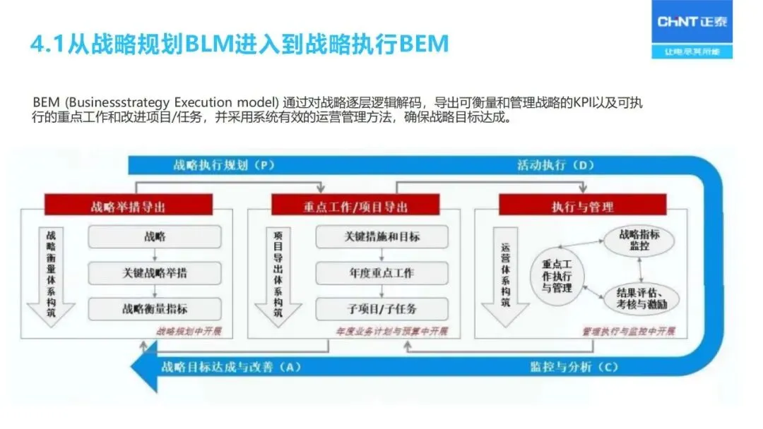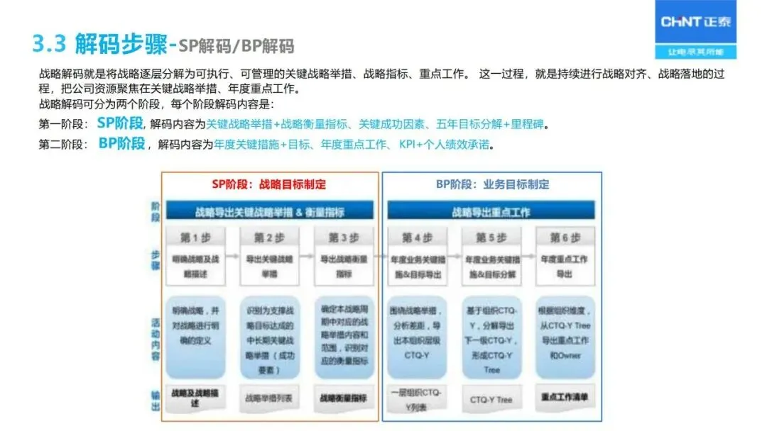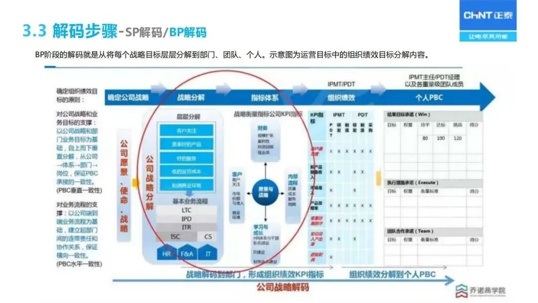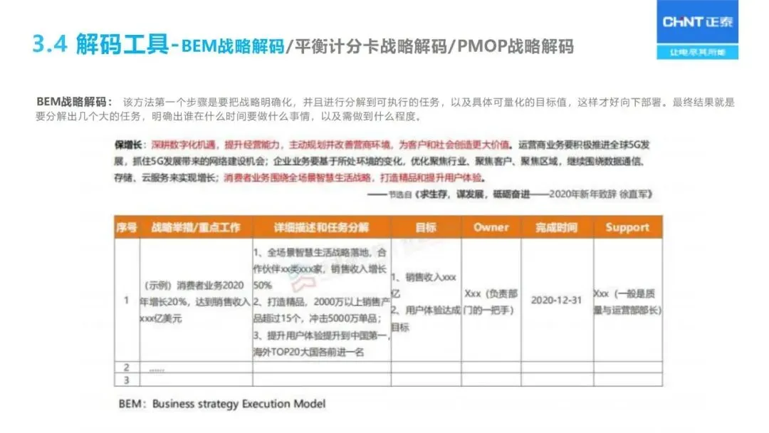 战略解码依赖于 BEM模型的分解:通过“六步法”将长期战略规划转化为年度经营计划,首先明确战略目标,确定关键成功因素和关键绩效指标,然后层层分解为部门目标、个人业绩承诺,同时采用“1+3模型”将战略、 HR、财务预算、过程改造等环节联系起来,保证上下一致,左右协调。