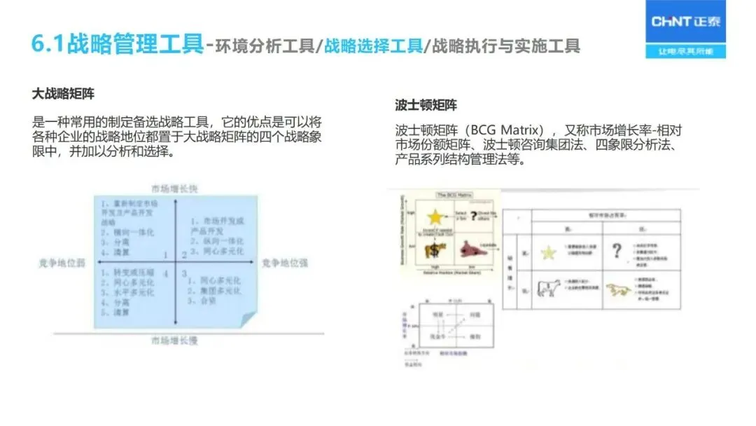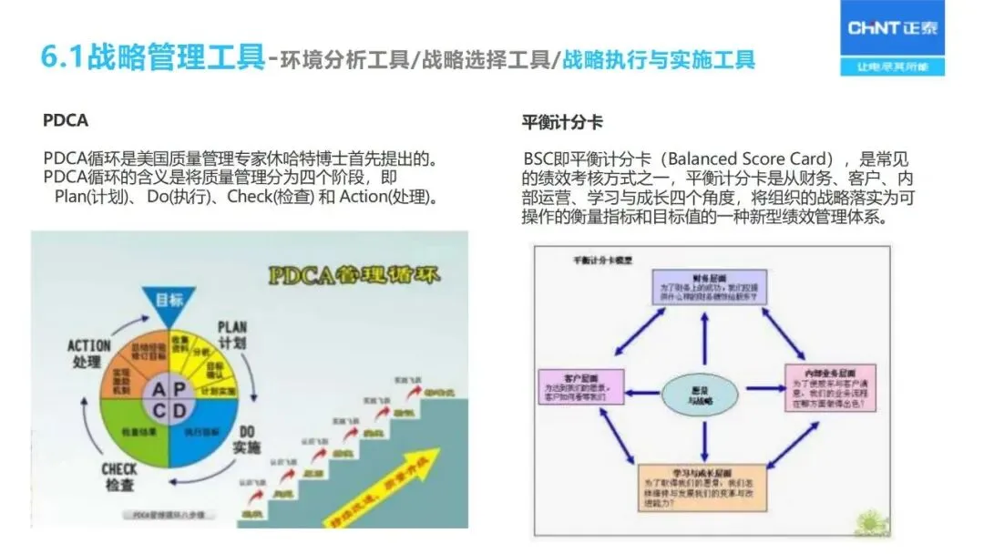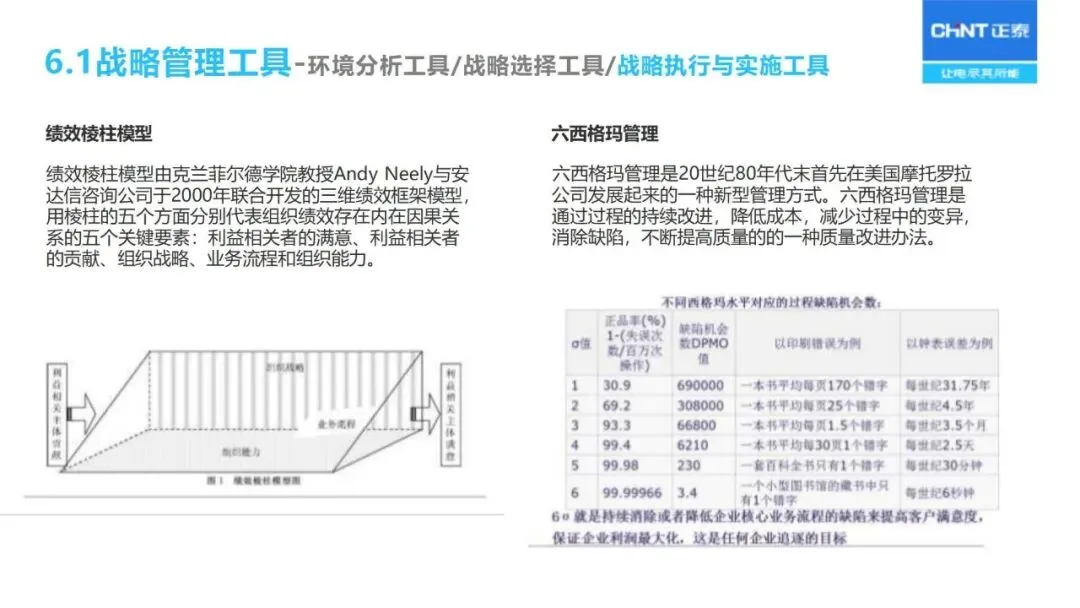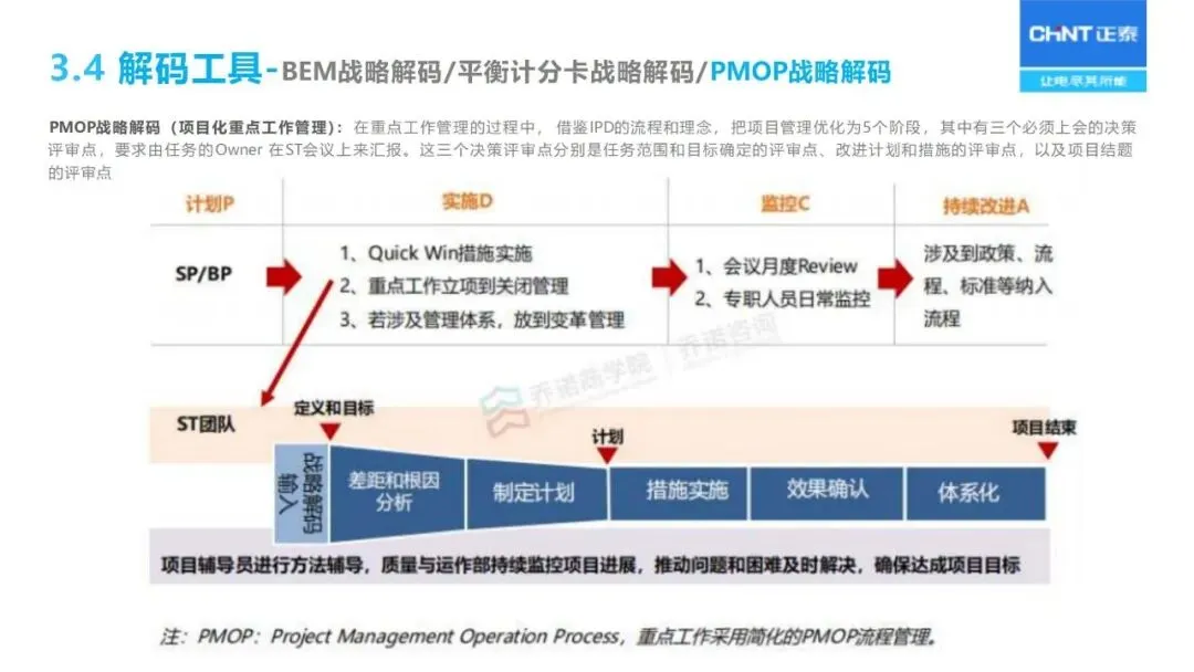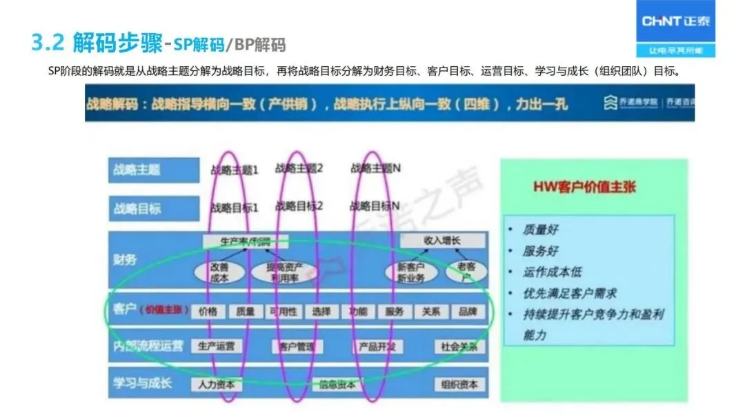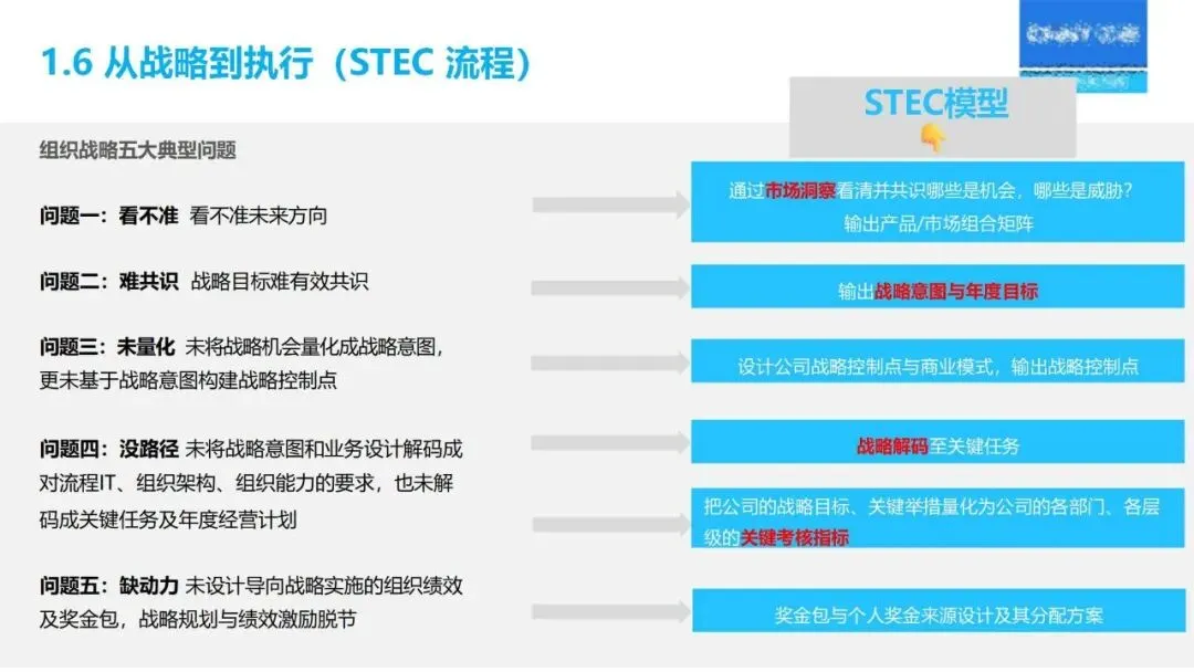 战略解码依赖于 BEM模型的分解:通过“六步法”将长期战略规划转化为年度经营计划,首先明确战略目标,确定关键成功因素和关键绩效指标,然后层层分解为部门目标、个人业绩承诺,同时采用“1+3模型”将战略、 HR、财务预算、过程改造等环节联系起来,保证上下一致,左右协调。