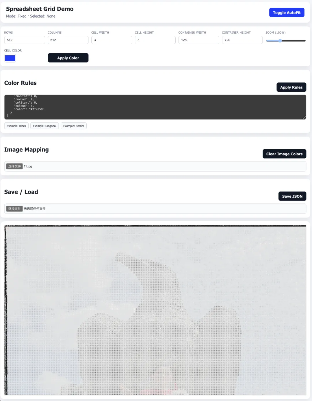 基于 React + TypeScript 的类 Excel 网格组件,支持数字行列头、自动/固定 尺寸、选择与填色、规则脚本着色、图片映射着色,以及 JSON 保存/加载。