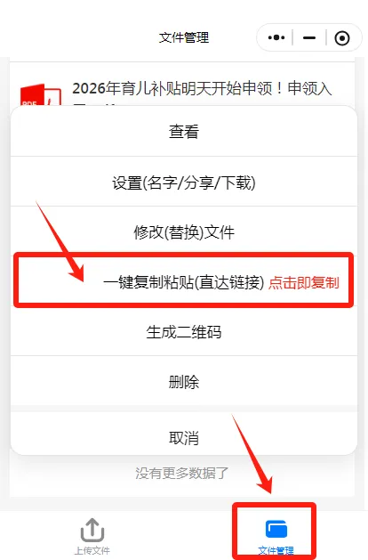 获取链接:文件上传完成后,点击Excel文件,点击“一键复制粘贴(直达链接),保存备用。