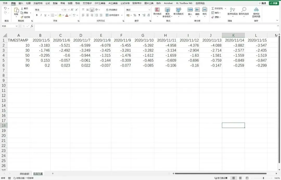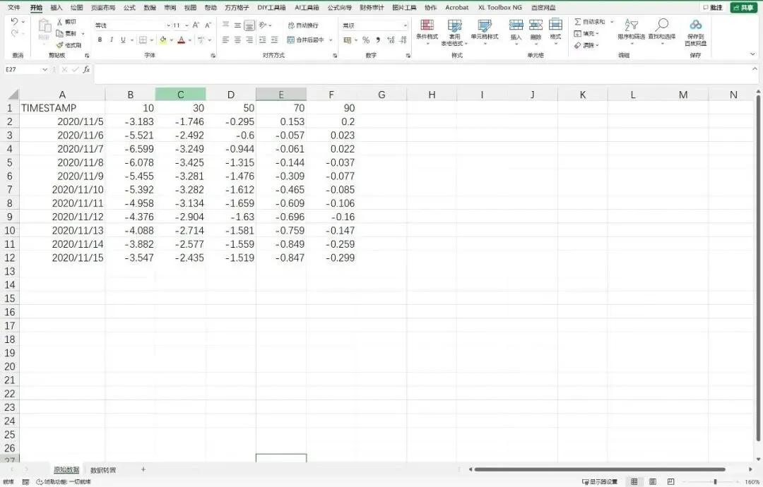 原始数据中,第一行为土壤深度,第一列为日期,其余单元格为不同深度对应的土壤温度值。