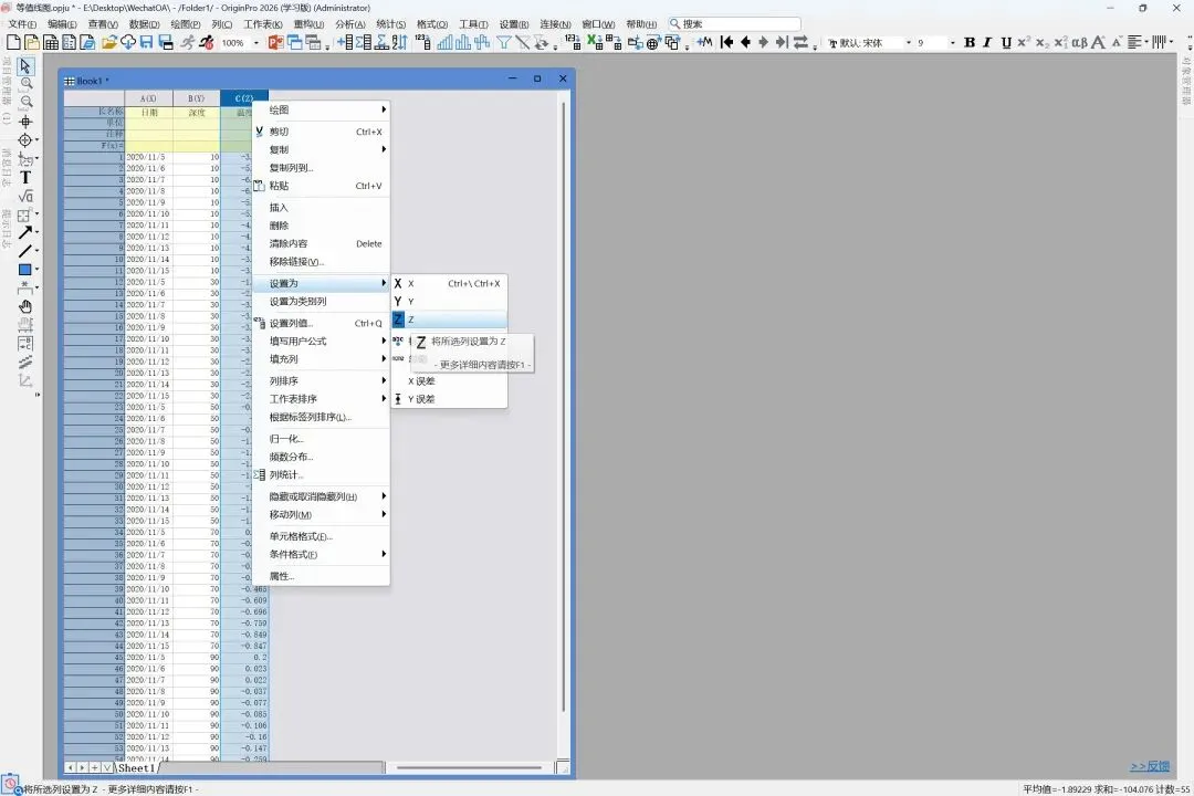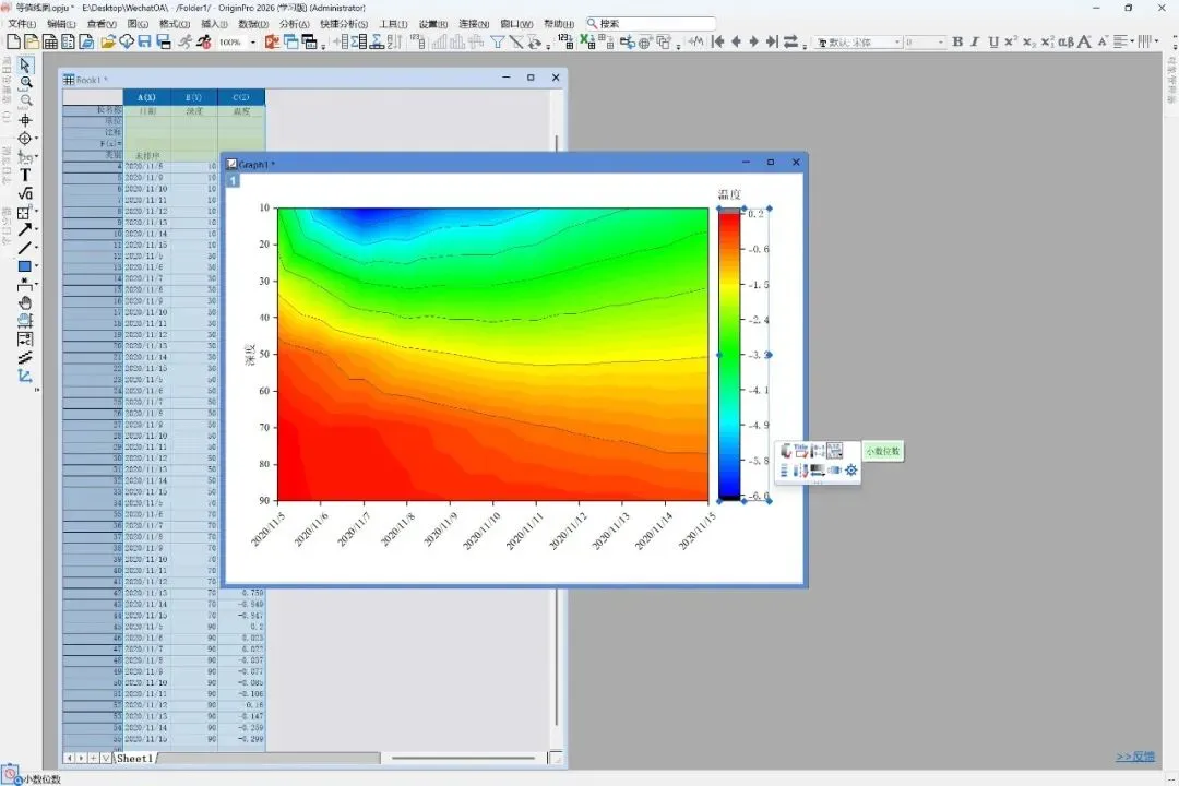 (1)将整理好的三列数据(日期、深度、温度)复制或导入至Origin。