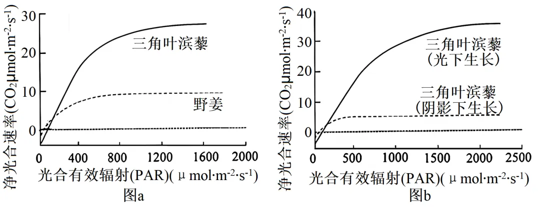 2. 图a为三角叶滨藜和野姜的光合作用光响应曲线,图b为长期在一定光强下生长的两株三角叶滨藜的光合作用光响应曲线,相关说法错误的是()