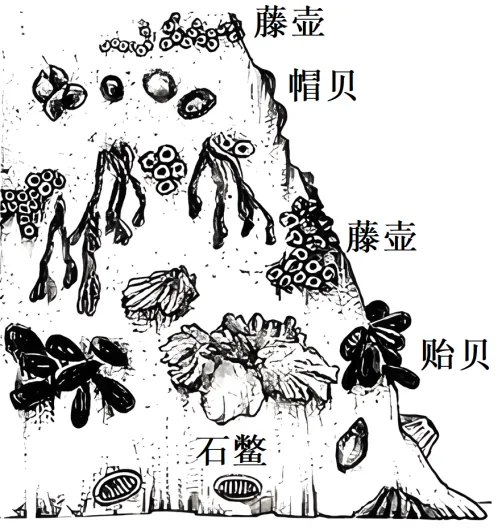 11. 图示某海边潮间带分布着藤壶、贻贝、帽贝和石鳖,海星以这四种动物为食。在一个16m2的实验样地中人为去除海星,几个月后藤壶在该样地占据优势,再过一段时间,贻贝成为最终占据优势的物种。下列说法正确的是()