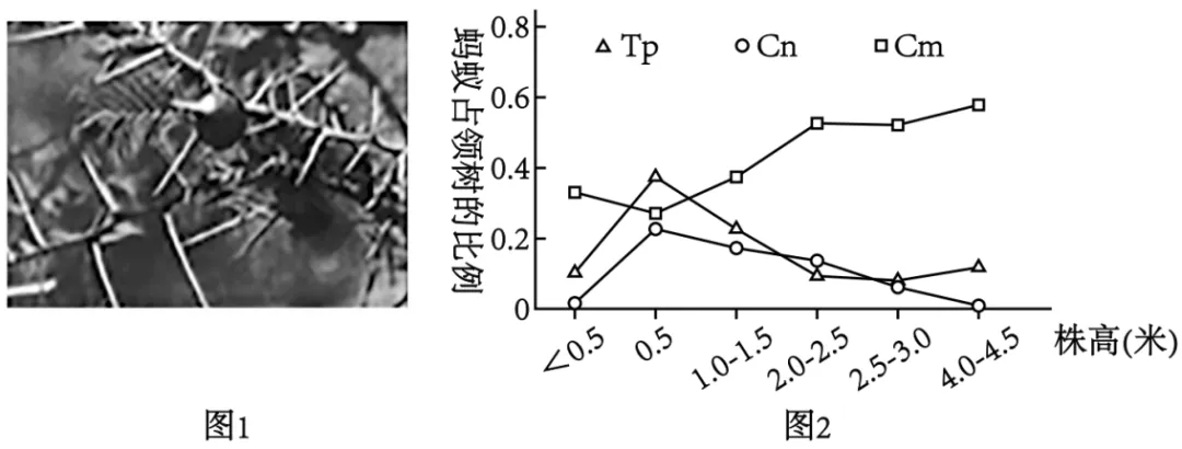 (2)稀树草原上常见的三种蚂蚁Cm、Cn和Tp争相占领哨刺金合欢树,通常一棵树上只存在一种蚂蚁。研究人员调查了不同高度的金合欢树被三种蚂蚁占领的比例(图2),据图可知三种蚂蚁中______的竞争能力最强,约占据了一半的哨刺金合欢树。