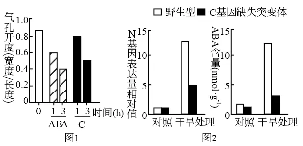 (2)分别用微量(0.1μmol·L-1)的C或ABA处理拟南芥根部后,检测叶片气孔开度,结果如下图1。据图1可知,C和ABA均能够_______,从而减少失水。