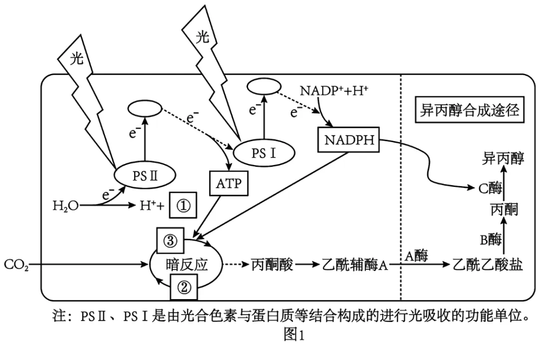 (3)创建异丙醇合成途径减少了细胞内NADPH含量,使细胞中ATP与NADPH的比例显著增加;能够有效地利用高强度光,促进光反应进行;提高蓝细菌对CO2的利用效率,促进暗反应进行,提高光合速率