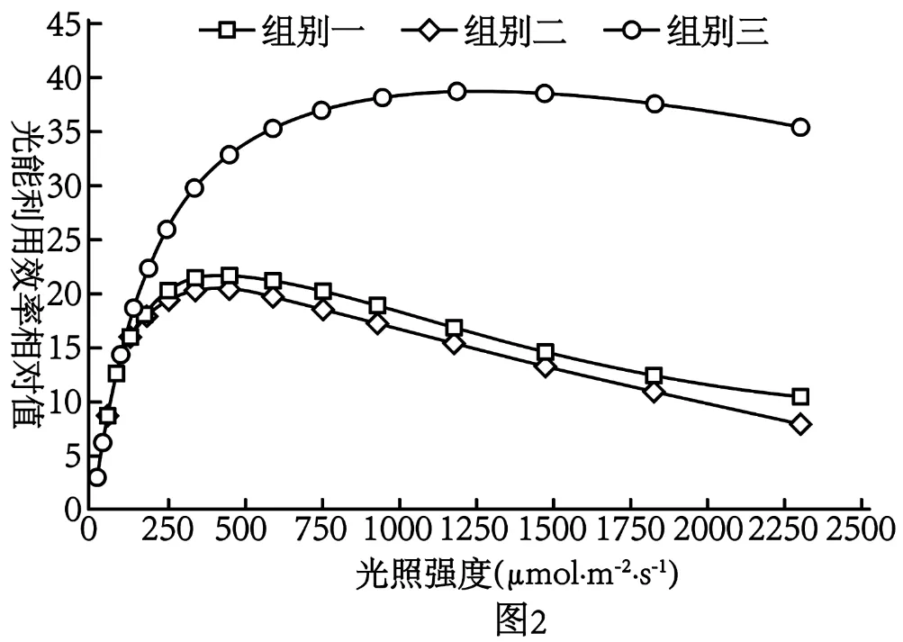 人们发现,在一些异养型微生物中存在着生成异丙醇的代谢途径。研究人员以蓝细菌为研究模型,通过导入三种外源酶(A、B、C酶)基因,在细胞原有的光合作用途径中创建了消耗NADPH的异丙醇合成途径,如图1所示,在C酶的催化反应中会消耗NADPH,相关指标的检测结果见表和图2,证明增加NADPH消耗途径可以有效提高蓝细菌的光合速率。