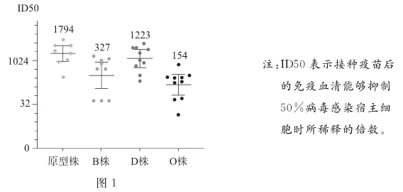 (2)随着SARS-CoV-2原型株在人群中的传播,变异毒株如Beta株(B株)、Delta株(D株)和Omicron株(O株)陆续出现。研究人员对以灭活原型株为主要成分的疫苗能否预防变异毒株进行研究,结果如图1。