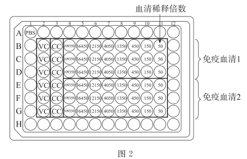图2所示为进行病毒中和实验使用的96孔板,其中所有的VC孔中均加入150ul细胞培养液、50ul宿主细胞悬液、50ul病毒液。所有的CC孔中均加入200ul细胞培养液和50ul宿主细胞悬液。中间48个实验孔中均先加入100ul细胞培养液、50ul______和50ul病毒液,混匀培养1小时后,再加入50ul______,一段时间后检测每孔细胞中的病毒相对值。其中VC孔和CC孔的作用分别是______。经数据分析,得出每种免疫血清的ID50。③不同小鼠免疫血清对不同毒株的SARS-CoV-2的病毒中和实验结果如图3所示。