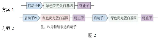 (2)科研人员拟向菌株E中导入新元件,得到菌株Ec,以通过观察饲喂菌株Ec的小鼠粪便中的荧光情况来诊断IBD严重程度。制备新元件有图2所示两种方案。