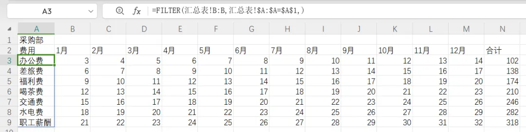 =FILTER(汇总表!B:B,汇总表!$A:$A="采购部",)