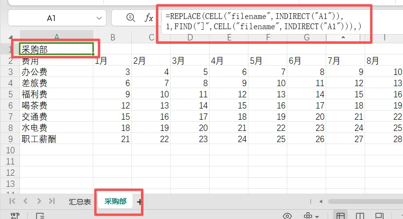 作用:自动提取当前工作表的名称(如"采购部")