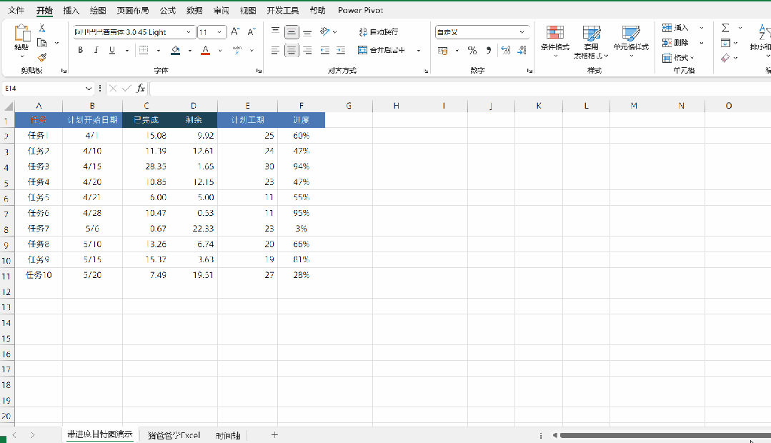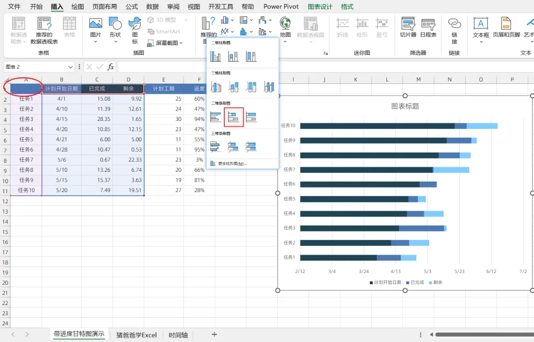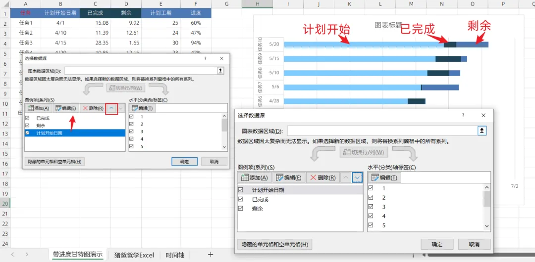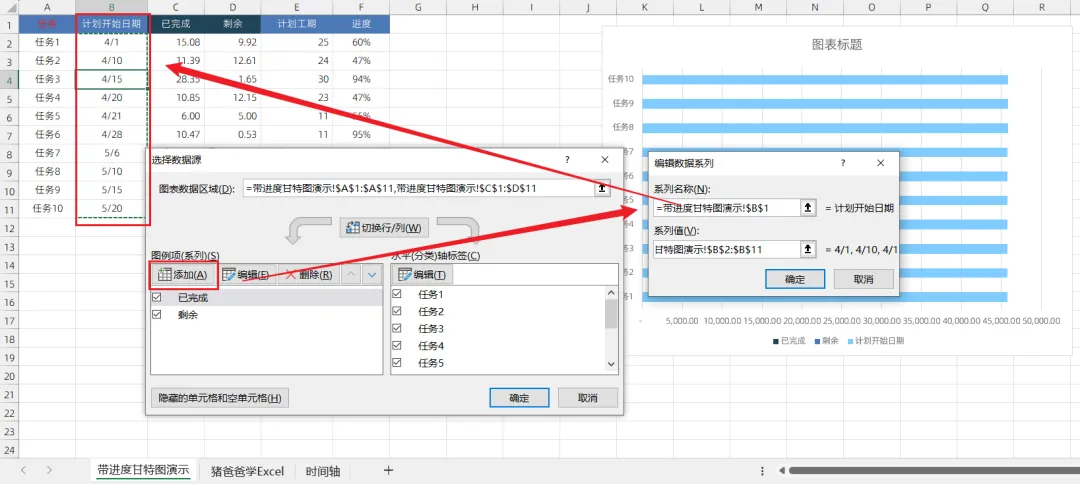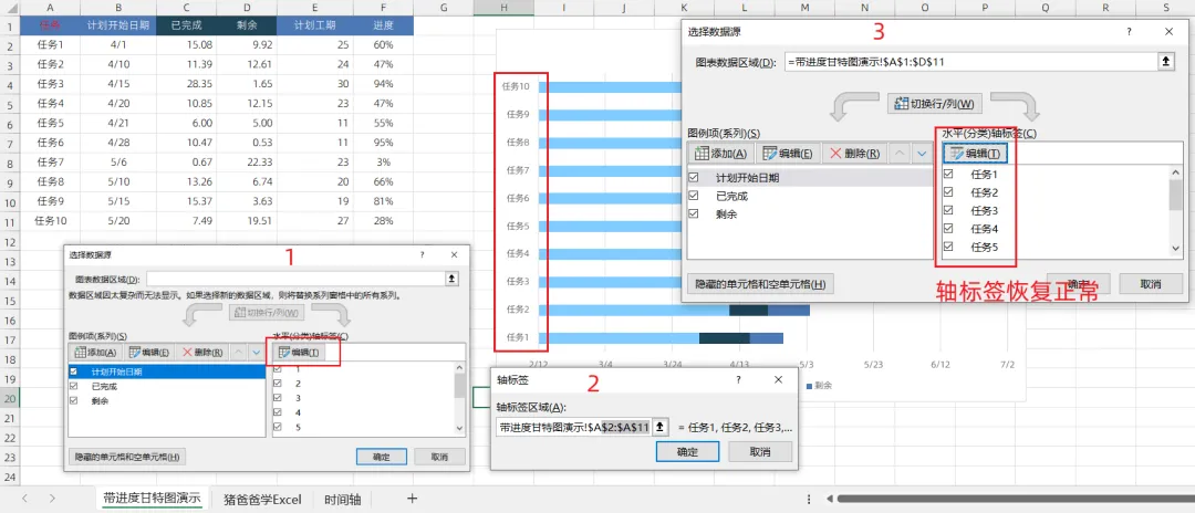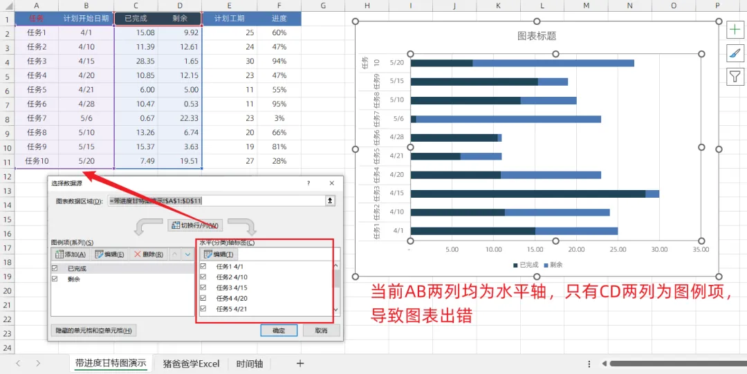 这一节是猪爸爸学excel标准/基础图表之图表水平轴绘制出错解决方法今天是一篇科普推文,还是那句话,相关的知识点在之前分享的各款图表中其实也有涉及到,不过还是有小伙伴会留言咨询,所以还是单独写一篇文章进行分享讲解。 如图所示,A列为任务,B列为“计划开始日期”,C列为根据进度计算出来已完成的天数,D列则为剩余的天数了,参考我之前分享的文章,使用BCD三列数据,是可以来绘制“带完成进度甘特图”的。当选择了对应A1:D11数据区域,【插入】-【堆积条形图】之后,会发现,为什么B列的“计划开始日期”居然和A列一起,变成了【水平轴标签】,结果就导致了我们的甘特图无法正确的显示了。至于表格为什么是这样子来判断的?这个暂时我也还没搞清楚,以后如果能弄懂原理了,一定再给大家讲一讲。现在呢,让我们先来看看,如何解决这个小问题。先来个常规的解决方法,在这个“错误”的图表,右键【选择数据】,调出【选择数据源】对话框,,点击【图例项(系列)】处的【添加】,调出【编辑数据系列】对话框,【系列名称】为对应的B1单元格,而【系列值】则为B2:B11数据区域。确定回到【选择数据源】对话框。接下来,很重要的一步,在【选择数据源】对话框,将刚添加的“计划开始日期”,移动到最上方,这样子,各系列在图表的位置恢复正确,这款甘特图才能正确显示,现在我们会发现,图表开始变得比较正常了。继续在【选择数据源】对话框,点击【水平(分类)轴标签】处的【编辑】按钮,调出【轴标签】对话框,在本例,我们重新指定【轴标签】对应区域为A2:A11数据区域,这样子,轴标签就正常了。现在,我们再来一种超神解决法,还是原来的数据,但是这次,A1单元格,我们删除内容,也就是不要标题!!注意,一定要是空白单元格。接着,我们再次选择A1:D11数据区域,【插入】-【堆积条形图】之后,会发现,哎呀,正常了,B列的数据,并不会被错误的判断为【水平轴】,而是正常的【图例项(系列)】,怎么样,是不是比上一种方法,简单一百倍,超神一百倍呢~~现在,最最重要的事情,随手点个赞,给个爱心推荐一下呗,传播爱心让更多的人知道,比心~~