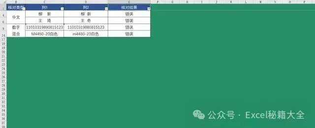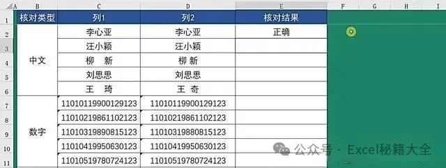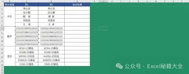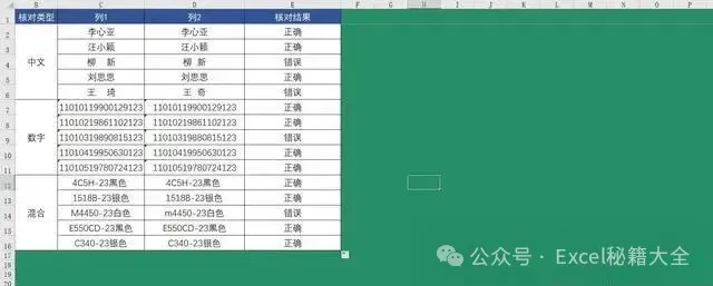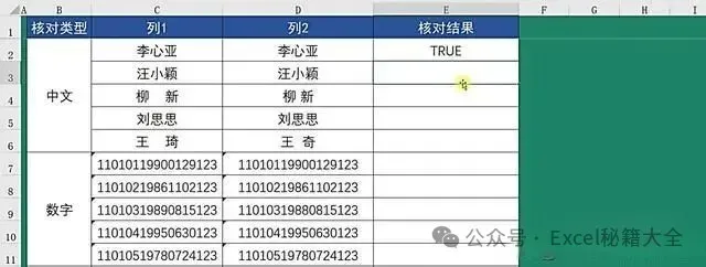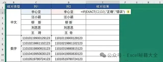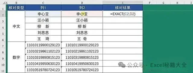 核对表格同行的两列内容是否100%一致,包括文字之间的空格、字母的大小写都在核对的指标中(图1),如果单纯地依靠眼睛一个个的去核对,那你可就是大冤种了。这种情况,你需要使用Exact函数,不管核对啥,都是轻而易举的事,管它是内容还是格式,Exact都会用放大镜仔细的帮你找不同。