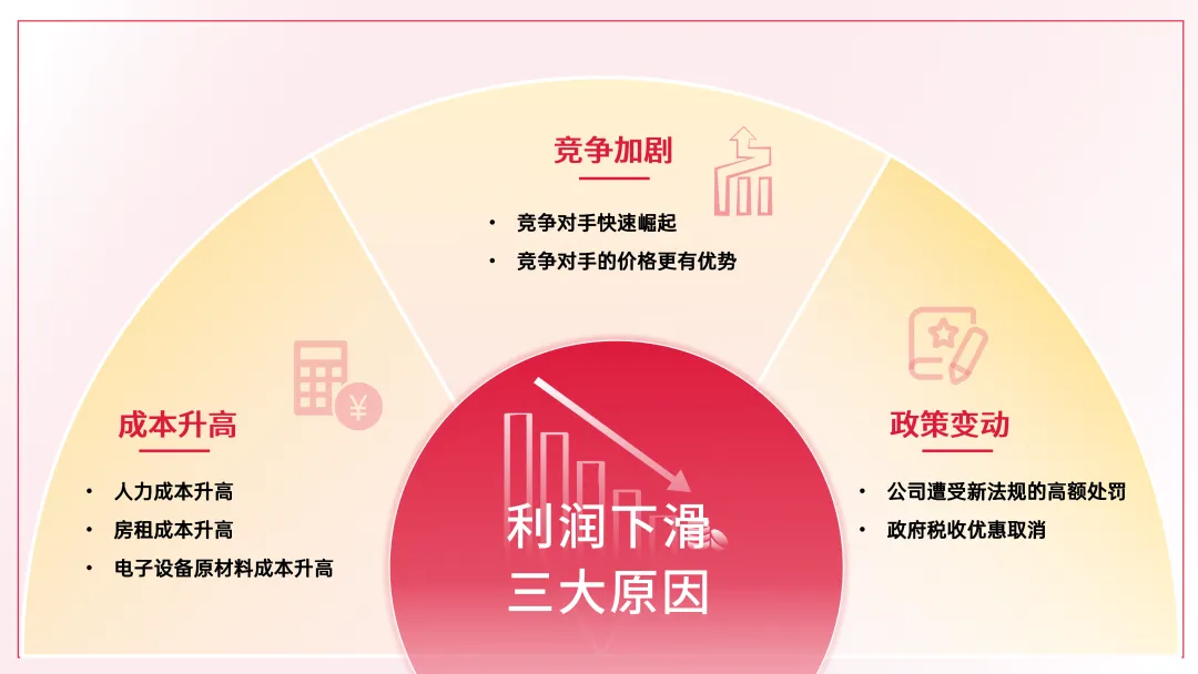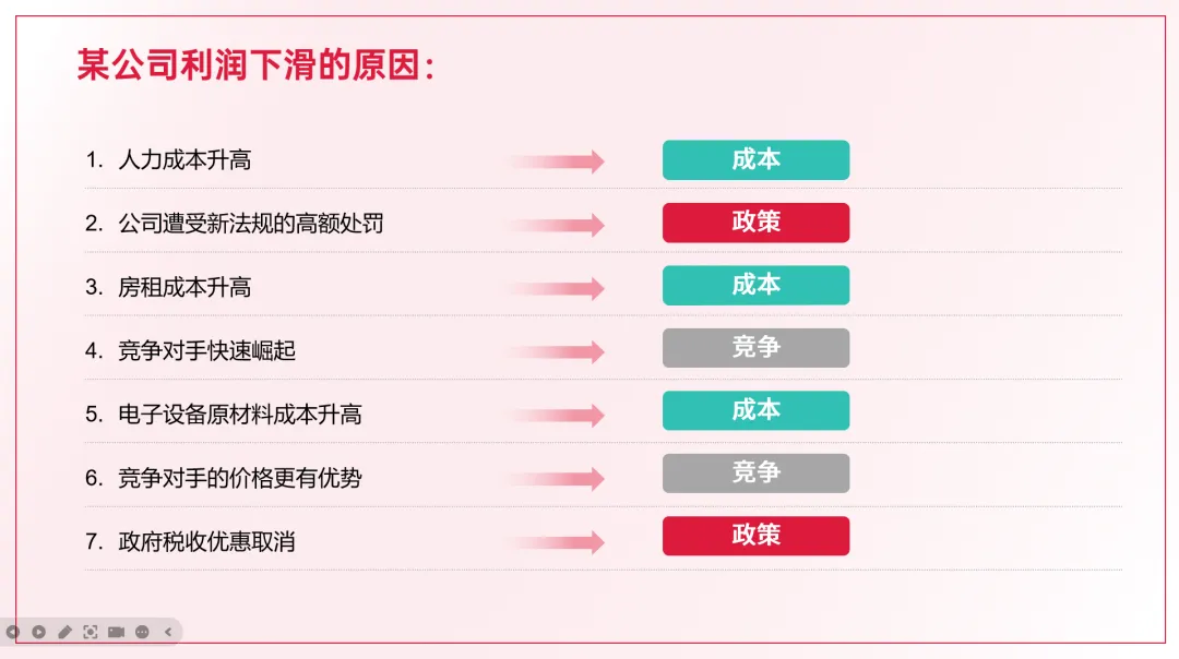 对三大类原因进行归纳,成本类的3个原因,都是因为成本升高了;竞争类的对手崛起和价格有优势,都表明竞争在加剧;政策为不可抗因素,正在发生变动,因此,对三大类原因高度概括之后,就成了成本升高、政策变动、竞争加剧。即【