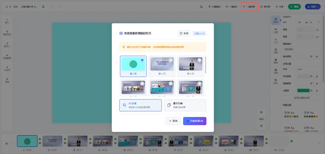 以“一键动画”为核心亮点,搭配智能动画引擎与多语种处理能力,为微课及数智讲义内容注入活力。针对抽象知识点,用户无需专业动画技能,点击“一键动画”即可触发系统自动生成可视化演示,如文字动画、转场动画、图表动画、知识点拆解等动态效果,将复杂内容直观化;支持多语种字幕实时生成与同步渲染,涵盖中英日韩等主流语言,兼顾跨境教学与多语言学习需求,同时支持字幕样式自定义,适配不同观看场景,与一键生成的动画内容精准同步,提升内容呈现质感。